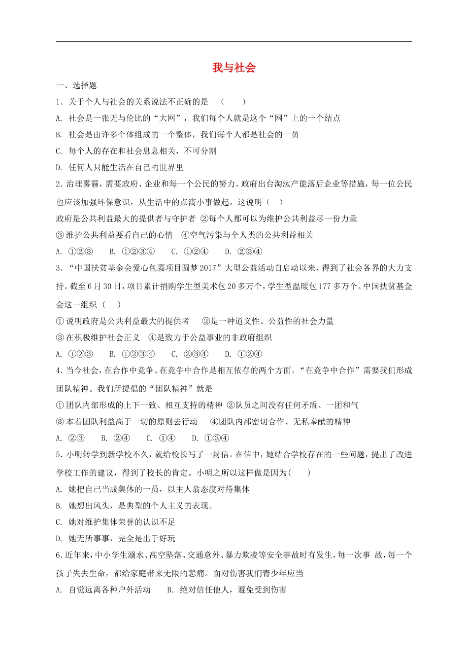 我与社会一、选择题1.关于个人与社会的关系说法不正确的是()A.社会是一张无与伦比的“大网”,我们每个人就是这个“网”上的一个结点B.社会是由许多个体组成的一个整体,我们每个人都是社会的一员C.每个人的存...