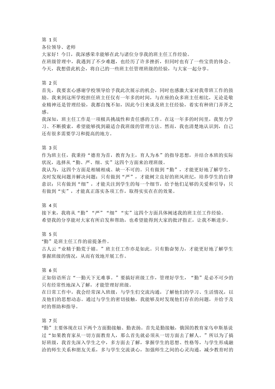第1页各位领导、老师大家好!今日,我深感荣幸能够在此与诸位分享我的班主任工作经验。在班级管理中,我遇到了不少难题,也经历了许多挫折,但同时也有了一些宝贵的体会。今天,我想借此机会,将自己的一些班主任...