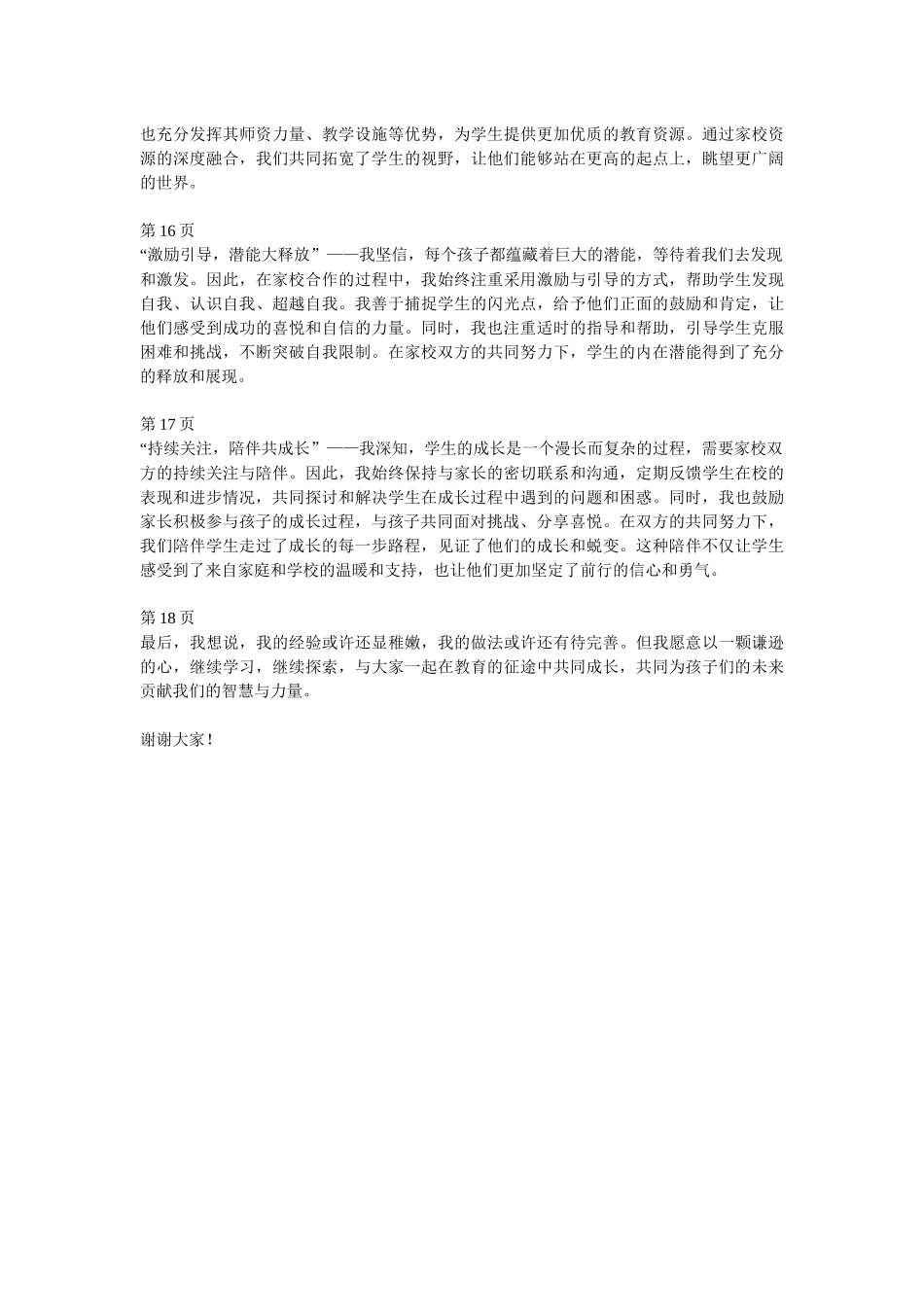 第1页:作为一位长期耕耘在教育一线的班主任,我深知在育人之路上,家校携手是至关重要的一环。今天,我想借此机会,向各位同仁分享几点我在班主任工作中的心得体会。第2页具体而言,我的经验分享包含3个部分内容...