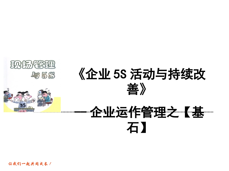 让我们一起共同成长!《企业5S活动与持续改善》--企业运作管理之【基石】1、专心听讲(请手机调整为震动状态)。2、积极思维(杜绝“鱼眼”现象)。3、互动学习(敞开心胸,积极投入,但须避免“小儿多动症”)。4...