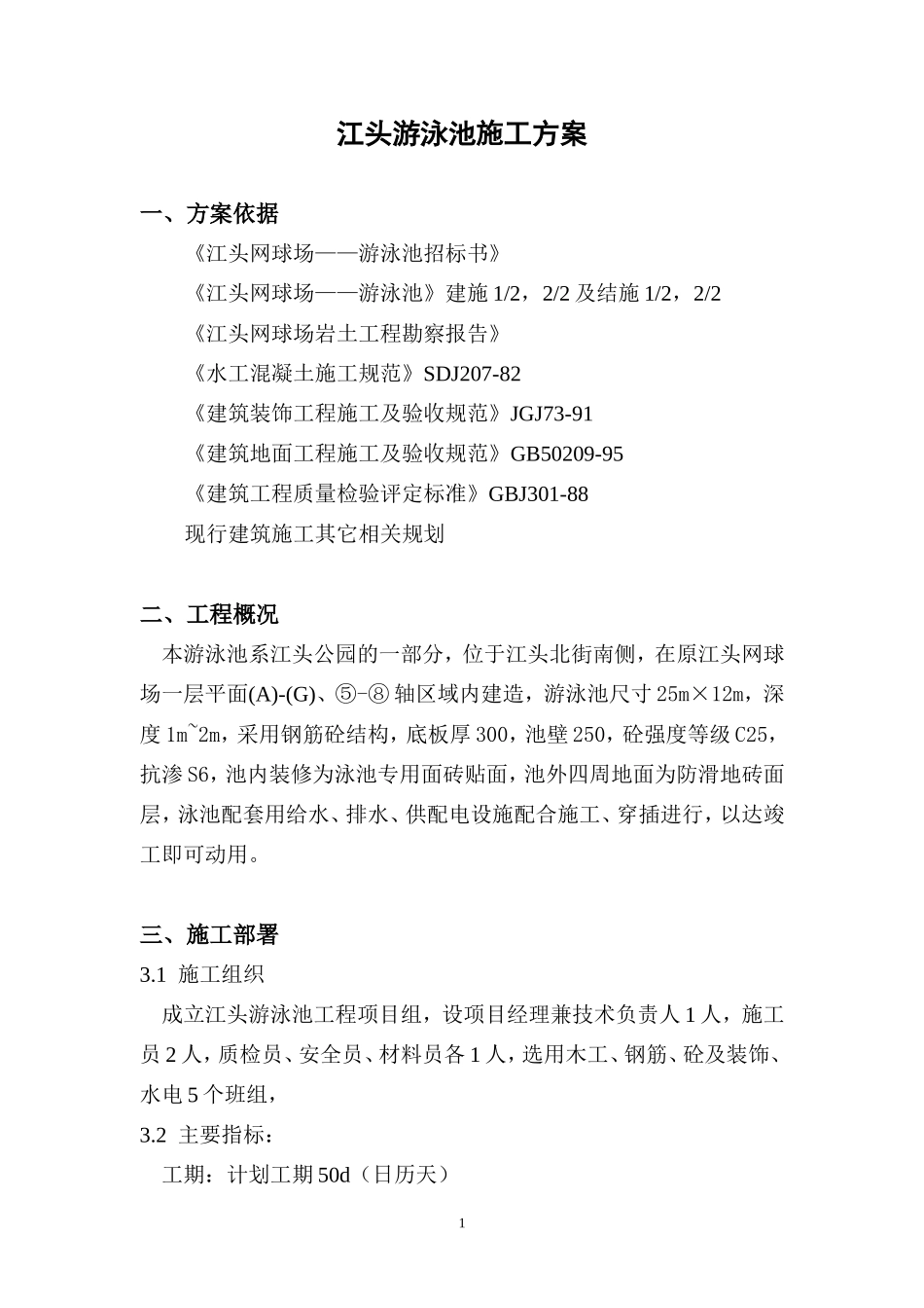 江头游泳池施工方案一、方案依据《江头网球场——游泳池招标书》《江头网球场——游泳池》建施1/2,2/2及结施1/2,2/2《江头网球场岩土工程勘察报告》《水工混凝土施工规范》SDJ207-82《建筑装饰工程施工及验收规...