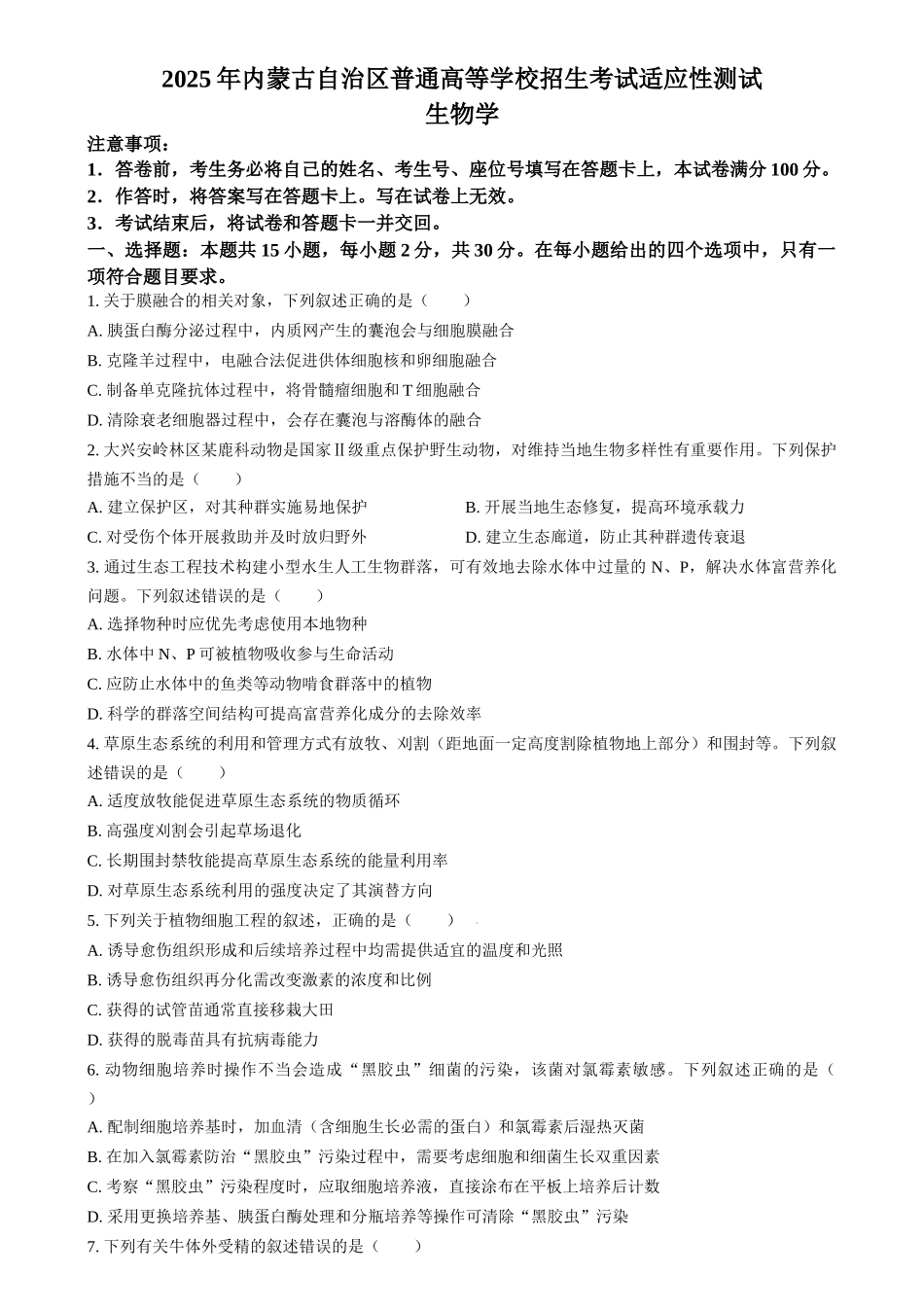 2025年内蒙古自治区普通高等学校招生考试适应性测试生物学注意事项:1.答卷前,考生务必将自己的姓名、考生号、座位号填写在答题卡上,本试卷满分100分。2.作答时,将答案写在答题卡上。写在试卷上无效。3.考...