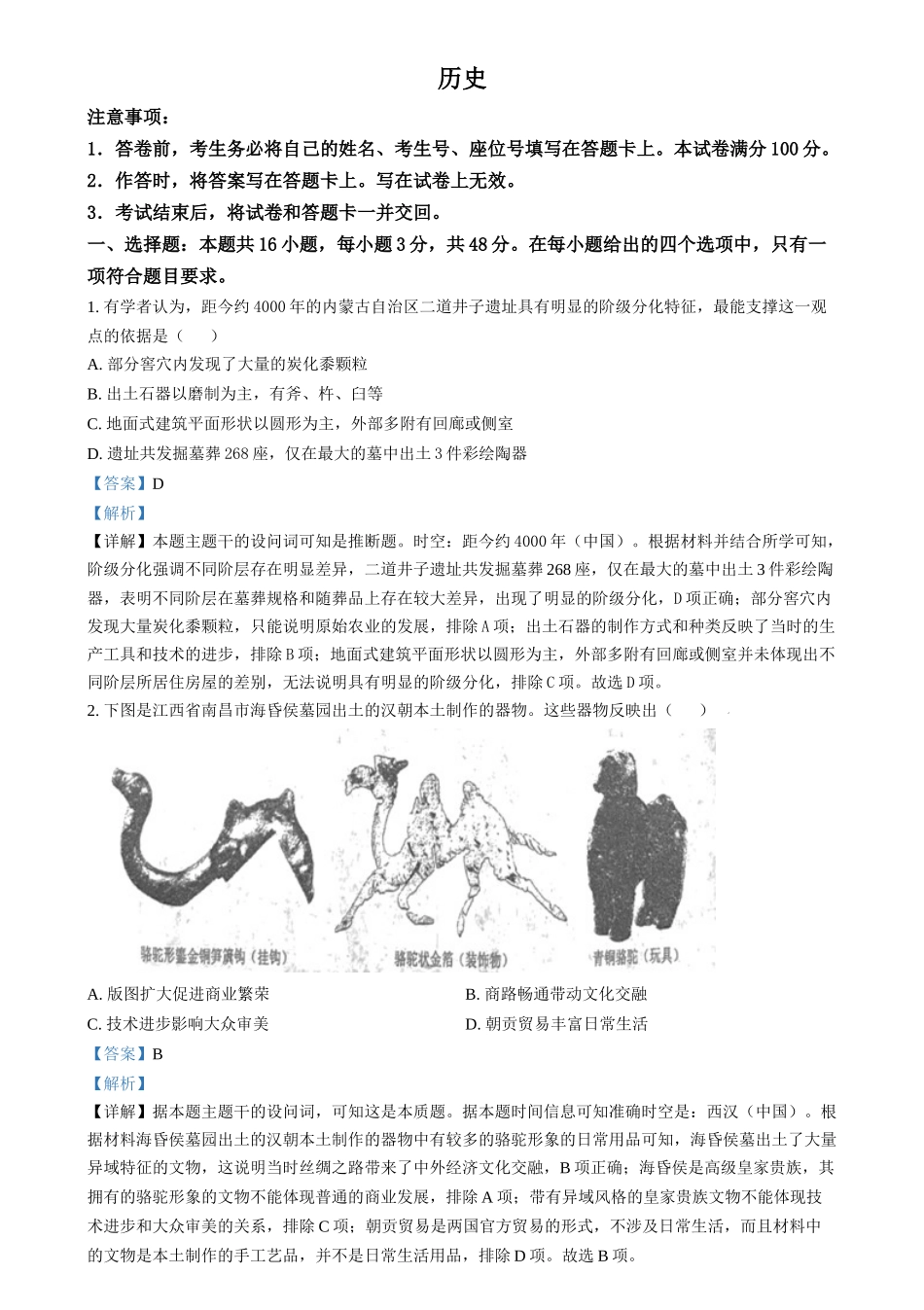 历史注意事项:1.答卷前,考生务必将自己的姓名、考生号、座位号填写在答题卡上。本试卷满分100分。2.作答时,将答案写在答题卡上。写在试卷上无效。3.考试结束后,将试卷和答题卡一并交回。一、选择题:本题...
