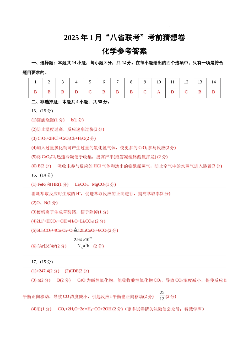2025年1月“八省联考”考前猜想卷化学参考答案一、选择题:本题共14小题,每小题3分,共42分。在每小题给出的四个选项中,只有一项是符合题目要求的。1234567891011121314BBBDCBBBCADCBD二、非选择题:本题共4小...