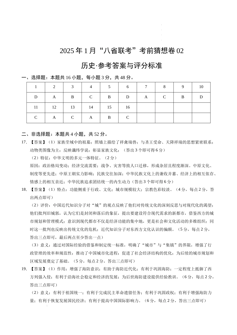 2025年1月“八省联考”考前猜想卷02历史·参考答案与评分标准一、选择题:本题共16小题,每小题3分,共48分。12345678910DABCBDACBD111213141516CACABC二、非选择题:本题共4小题,共52分。17.【答案】(1)家族...