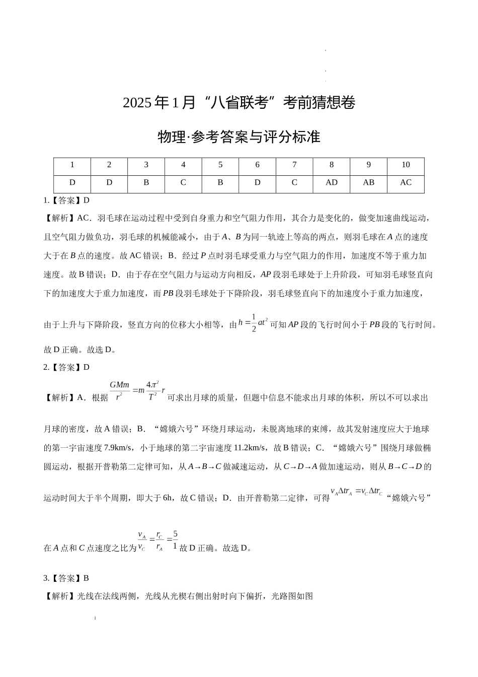 2025年1月“八省联考”考前猜想卷物理·参考答案与评分标准12345678910DDBCBDCADABAC1.【答案】D【解析】AC.羽毛球在运动过程中受到自身重力和空气阻力作用,其合力是变化的,做变加速曲线运动,且空气阻力做负...