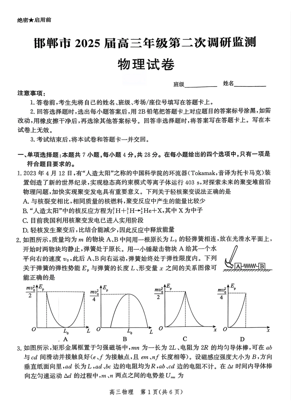 河北省邯郸市2025届高三第二次调研物理试卷.pdf_第1页