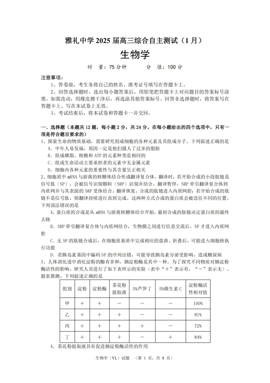 湖南省长沙市雅礼中学2024-2025学年高三上学期1月综合自主测试生物(YL).pdf
