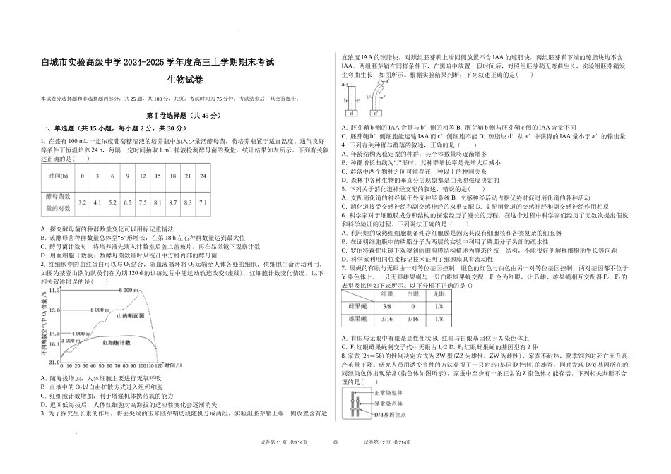 白城市实验高级中学2024-2025学年度高三上学期期末考试生物试卷本试卷分选择题和非选择题两部分,共25题,共100分,共页。考试时间为75分钟。考试结束后,只交答题卡。第Ⅰ卷选择题(共45分)一、单选题(共15小...