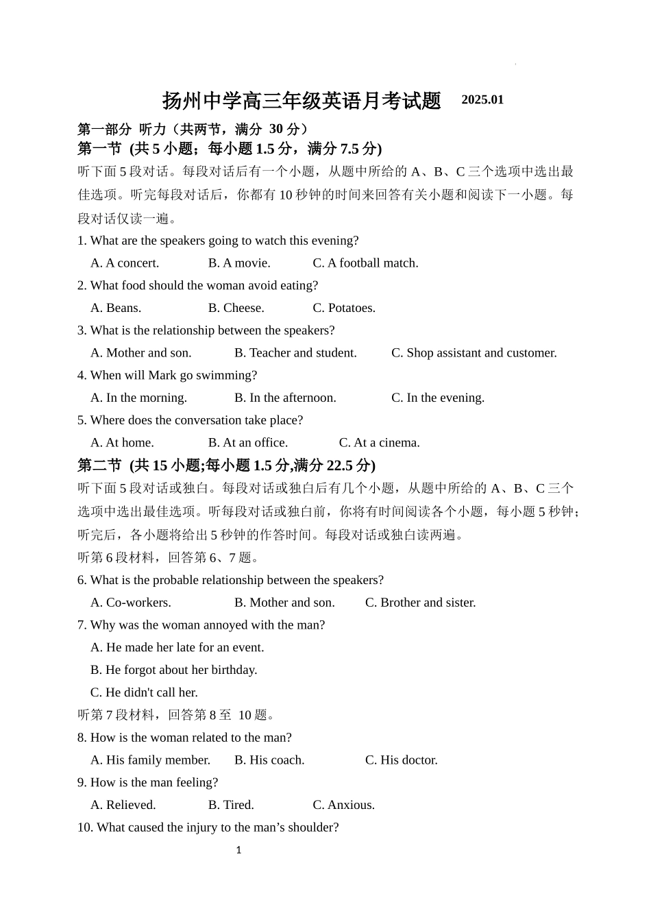 1扬州中学高三年级英语月考试题2025.01第一部分听力(共两节,满分30分)第一节(共5小题;每小题1.5分,满分7.5分)听下面5段对话。每段对话后有一个小题,从题中所给的A、B、C三个选项中选出最佳选项。听完每段对...
