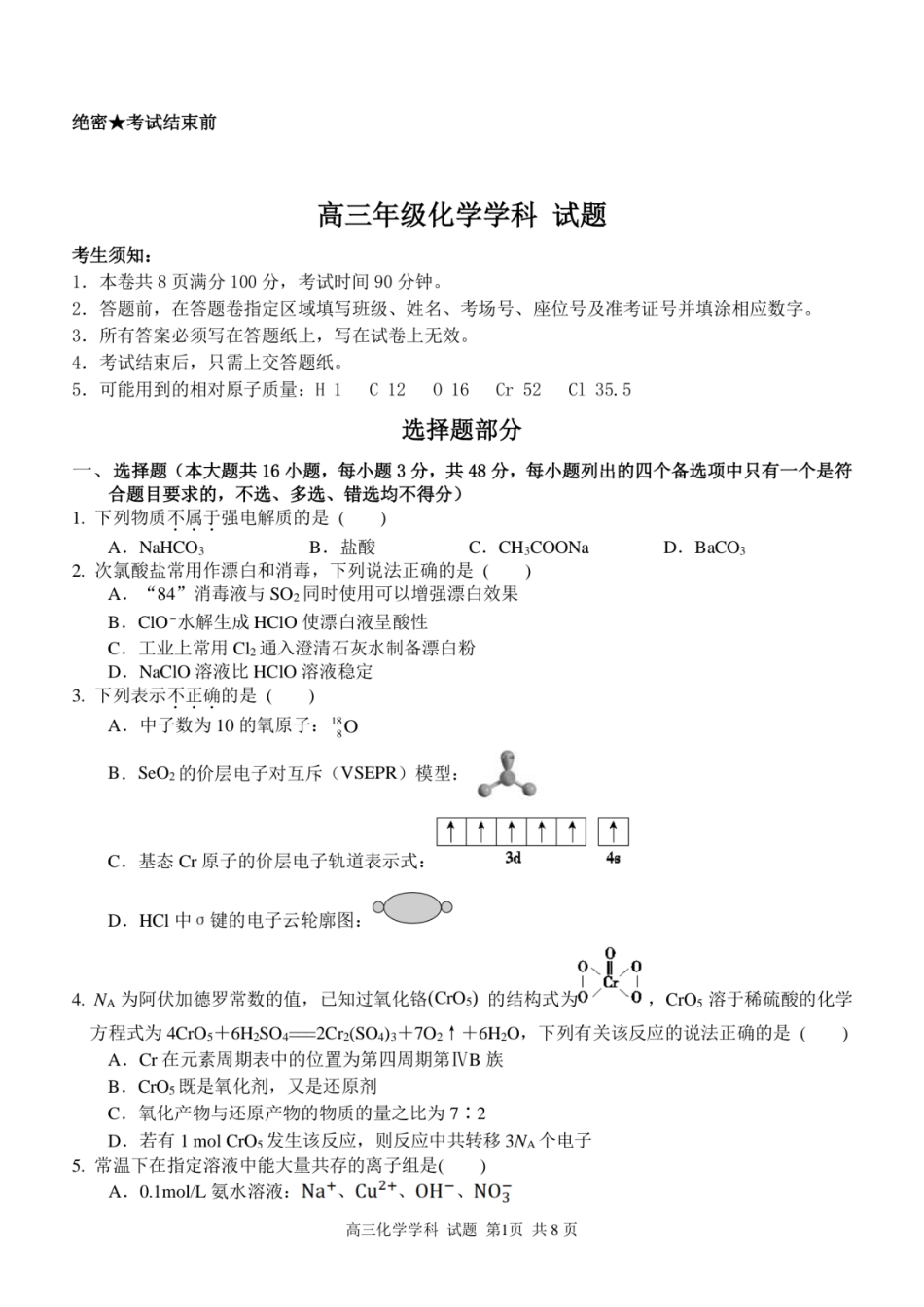 浙江省北斗星盟2024-2025学年高三上学期12月月考化学试卷及答案.pdf_第1页