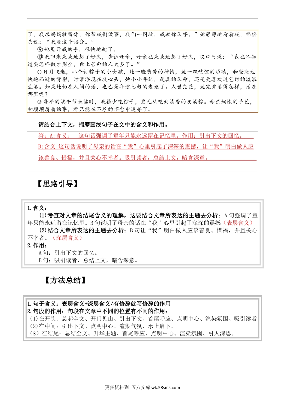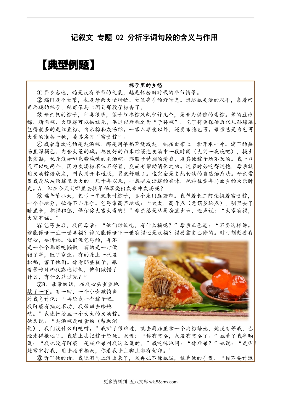 记叙文专题02分析字词句段的含义与作用【典型例题】粽子里的乡愁①异乡客地,越是没有年节的气氛,越是怀念旧时代的年节情景。②端阳是个大节,也是母亲大忙特忙、大显身手的好时光。想起她灵活的双手,裹着四角...