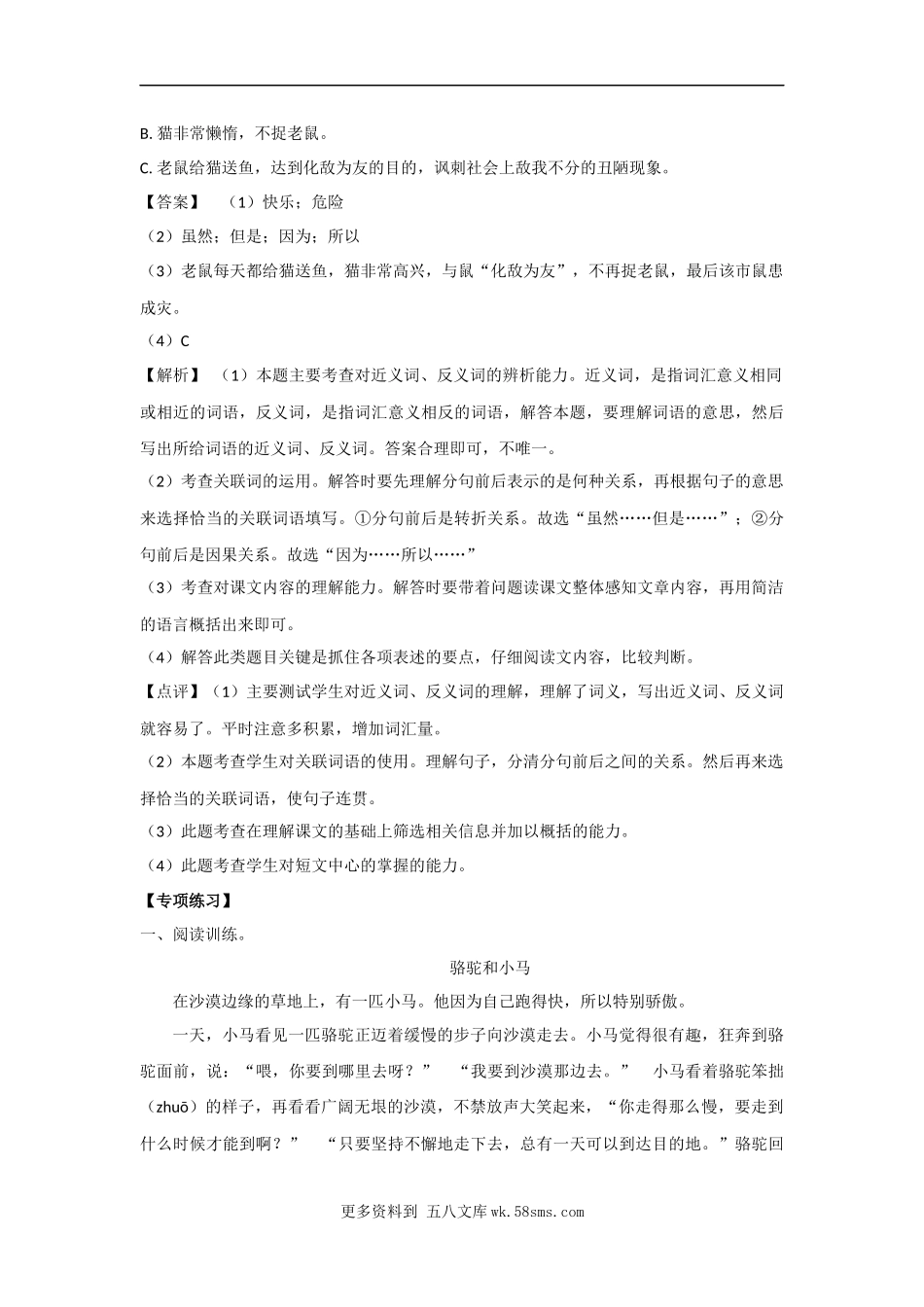 第二单元课外阅读-优尖升教育三年级语文下册(部编版)班级姓名成绩【典例精析】例:阅读下文,回答问题。老鼠买鱼一天,鼠倾巢出动,跑到大街上要把所有的鱼全买下来。鱼行老板问:“你们不愁吃喝,买那么多鱼干...