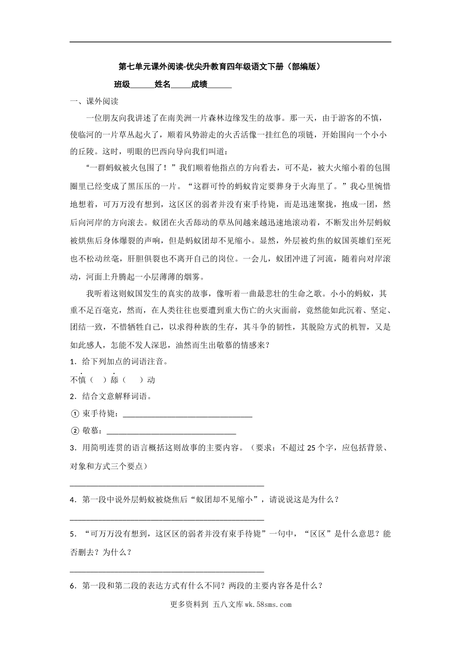第七单元课外阅读-优尖升教育四年级语文下册(部编版)班级姓名成绩一、课外阅读一位朋友向我讲述了在南美洲一片森林边缘发生的故事。那一天,由于游客的不慎,使临河的一片草丛起火了,顺着风势游走的火舌活像一...