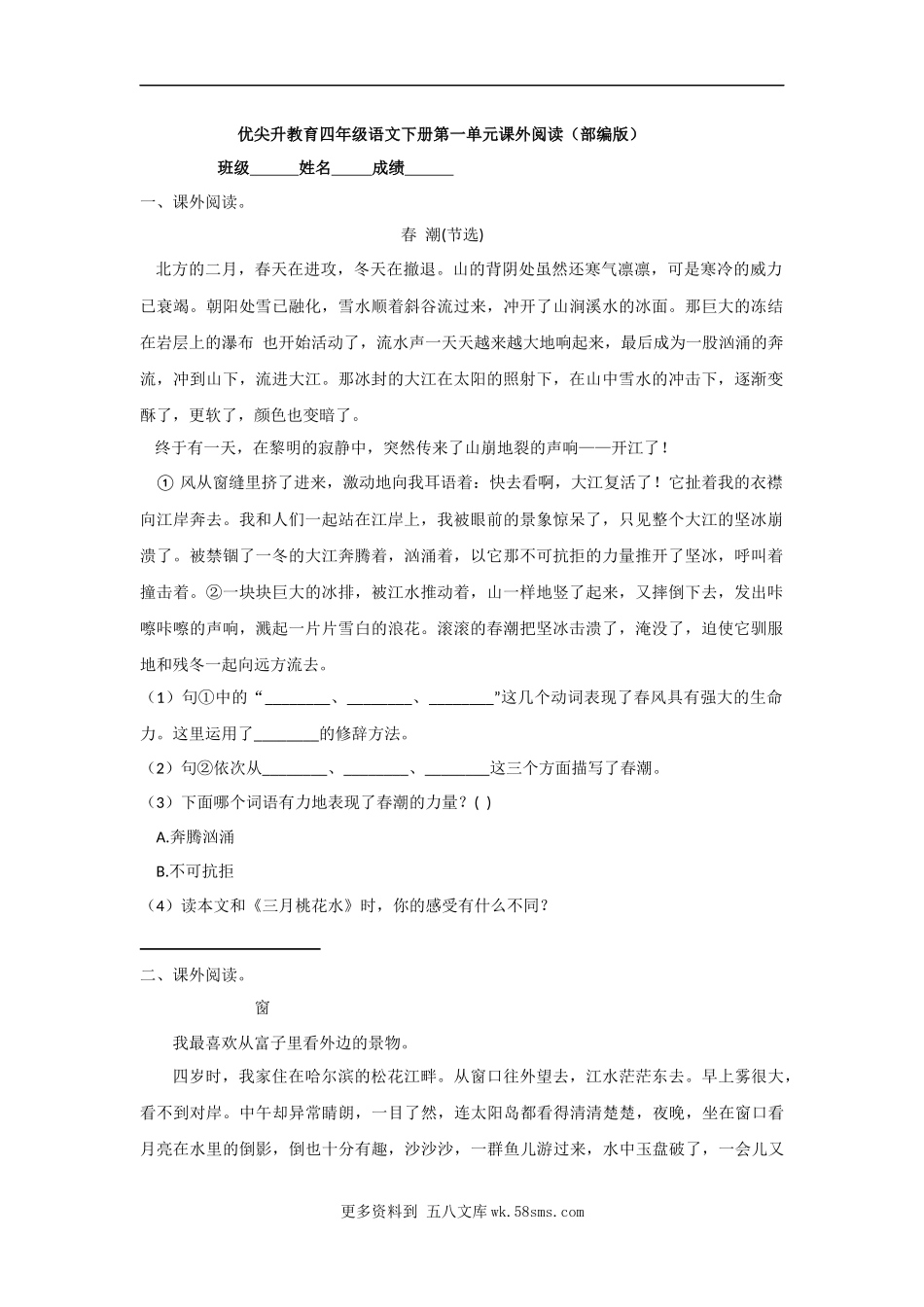 优尖升教育四年级语文下册第一单元课外阅读(部编版)班级姓名成绩一、课外阅读。春潮(节选)北方的二月,春天在进攻,冬天在撤退。山的背阴处虽然还寒气凛凛,可是寒冷的威力已衰竭。朝阳处雪已融化,雪水顺着斜...
