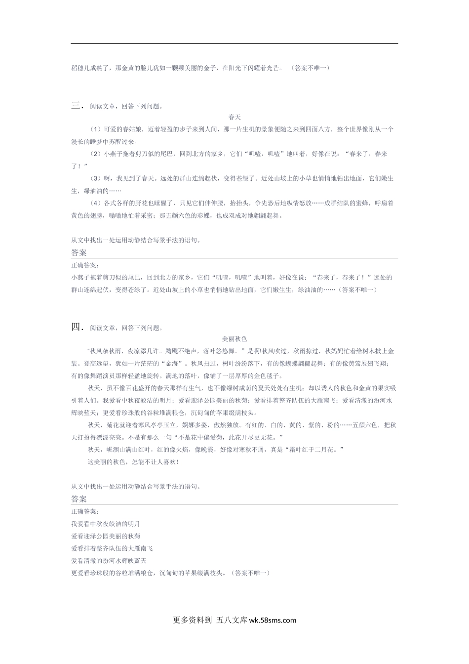 分析动静结合的描写方法一.阅读文章,回答下列问题。雪雪,在我的童年生活中的记忆异常深刻。雪,就像一个个小精灵从天而降;雪,犹如一个个小音符在天空跳动;雪,仿佛一位仙女降临人间。我喜欢洁白无瑕的雪。...