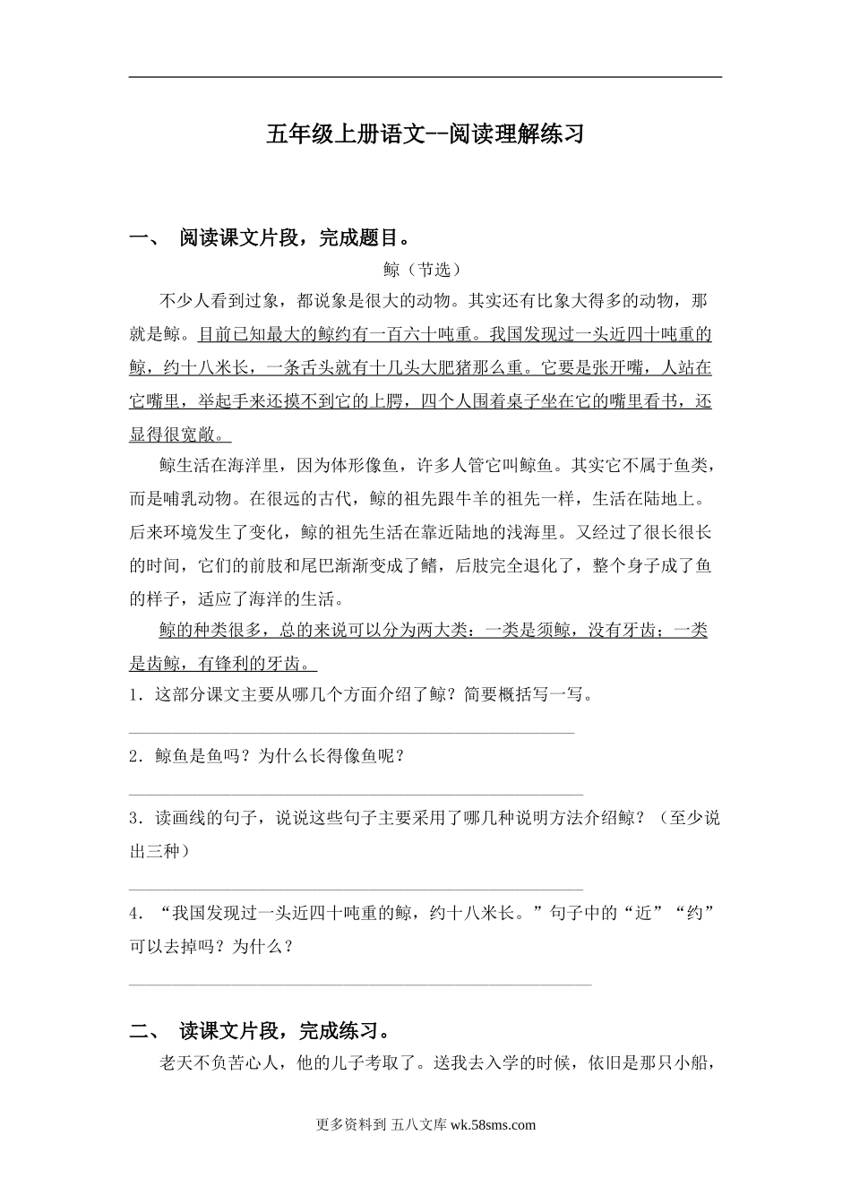 五年级上册语文--阅读理解练习一、阅读课文片段,完成题目。鲸(节选)不少人看到过象,都说象是很大的动物。其实还有比象大得多的动物,那就是鲸。目前已知最大的鲸约有一百六十吨重。我国发现过一头近四十吨重...