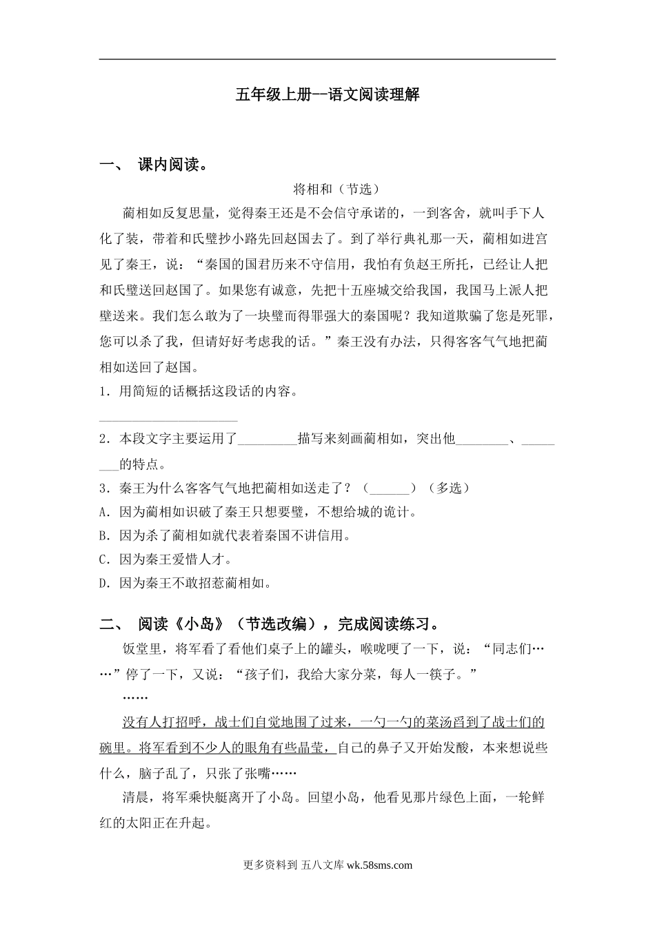 五年级上册--语文阅读理解一、课内阅读。将相和(节选)蔺相如反复思量,觉得秦王还是不会信守承诺的,一到客舍,就叫手下人化了装,带着和氏璧抄小路先回赵国去了。到了举行典礼那一天,蔺相如进宫见了秦王,说...