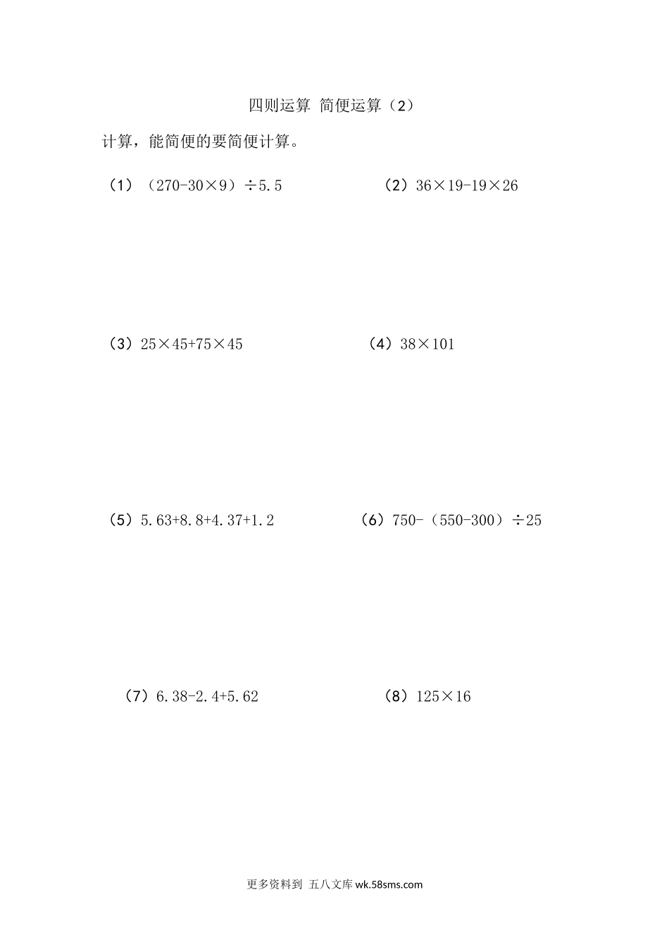 四则运算简便运算(2)计算,能简便的要简便计算。(1)(270-30×9)÷5.5(2)36×19-19×26(3)25×45+75×45(4)38×101(5)5.63+8.8+4.37+1.2(6)750-(550-300)÷25(7)6.38-2.4+5.62(8)125×16更...