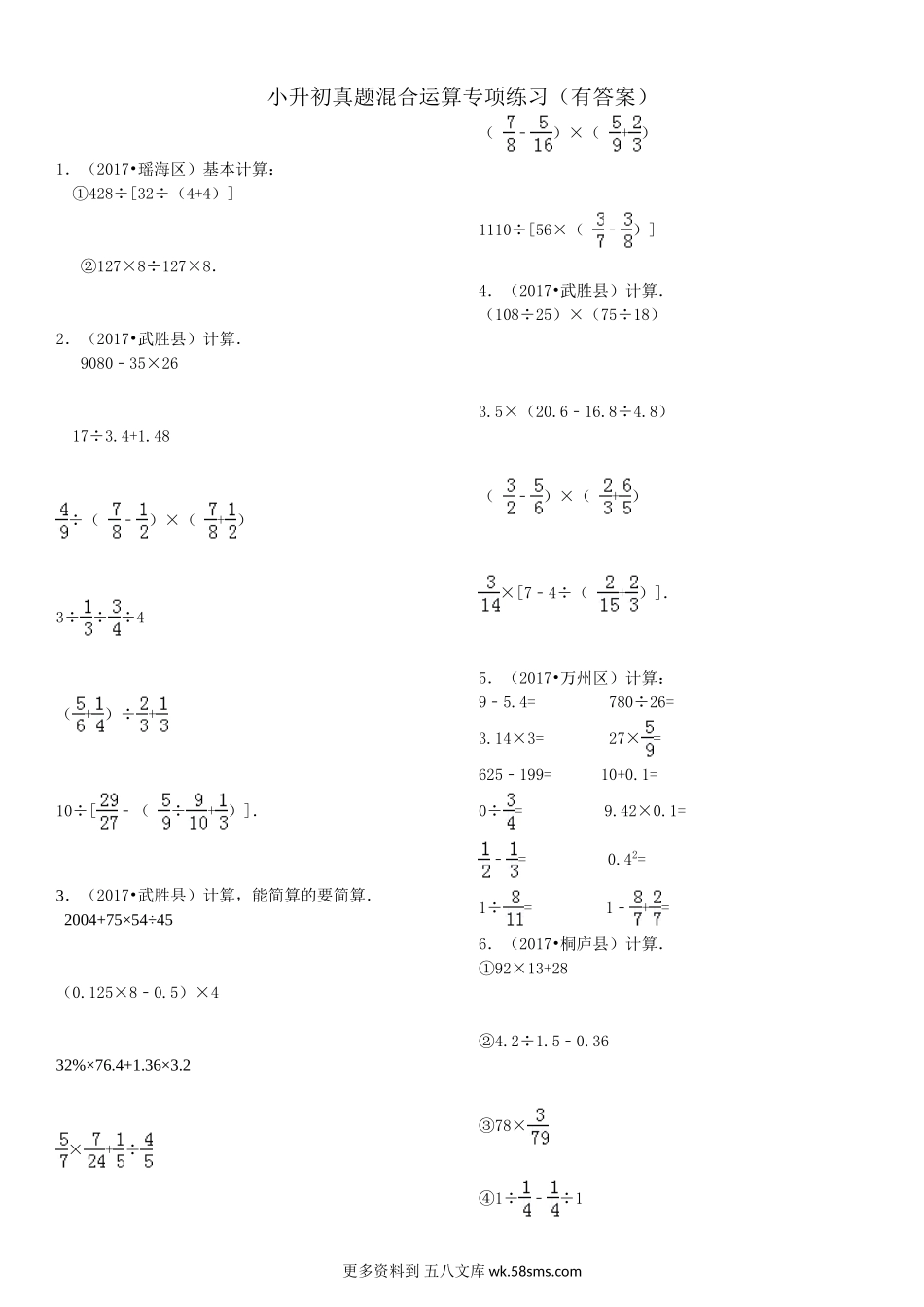 小升初真题混合运算专项练习(有答案)1.(2017•瑶海区)基本计算:①428÷[32÷(4+4)]②127×8÷127×8.2.(2017•武胜县)计算.9080﹣35×2617÷3.4+1.48÷(﹣)×(+)3÷÷÷4(+)÷+10÷[﹣(÷+)...