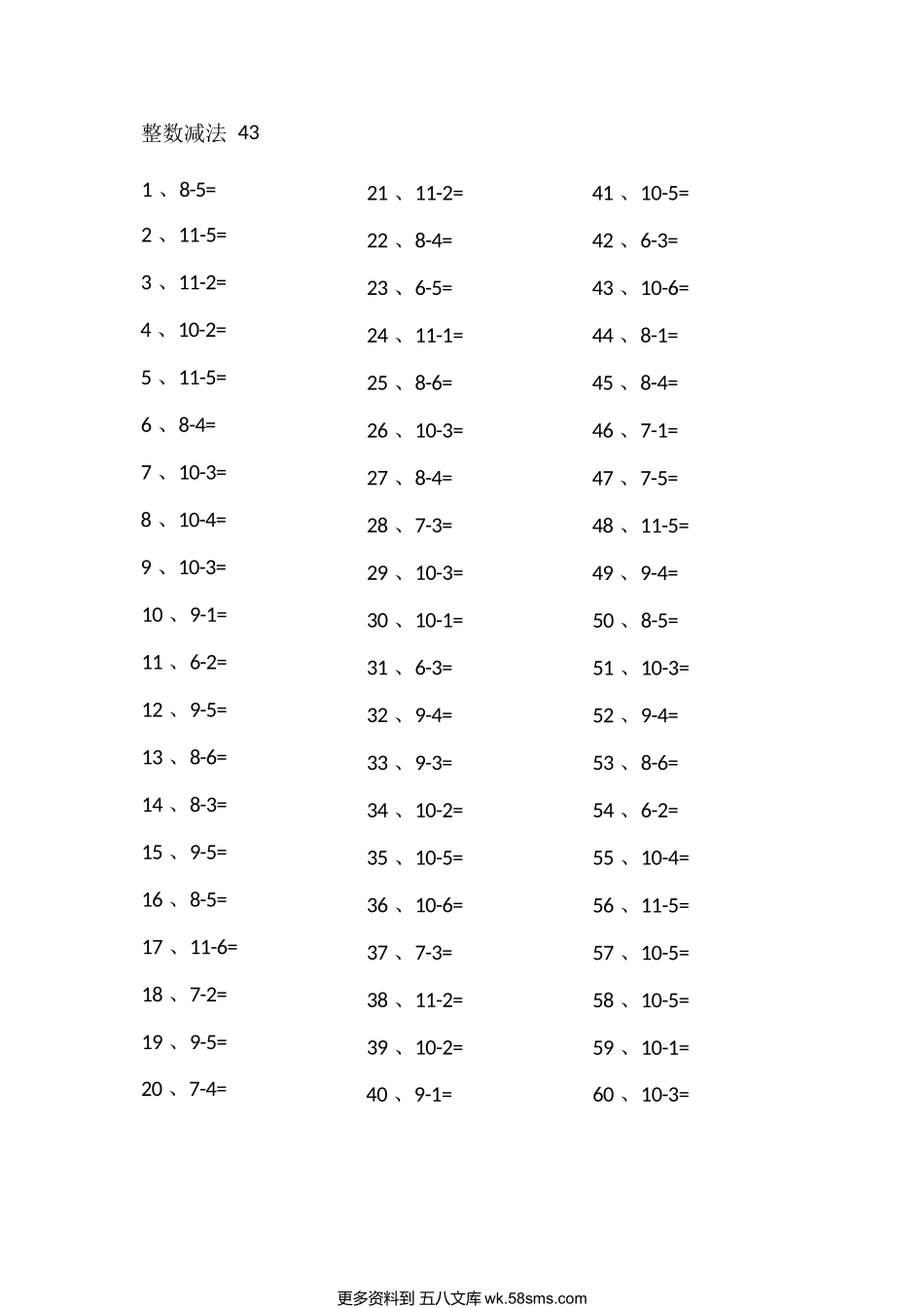 整数减法411、7-6=2、11-6=3、8-4=4、9-2=5、8-4=6、11-4=7、10-5=8、9-1=9、6-1=10、11-4=11、6-1=12、6-1=13、8-2=14、8-2=15、7-2=16、11-3=17、11-6=18、9-6=19、8-5=20、7-4=21、6-3=22、9-5=23、10-1=24、1...