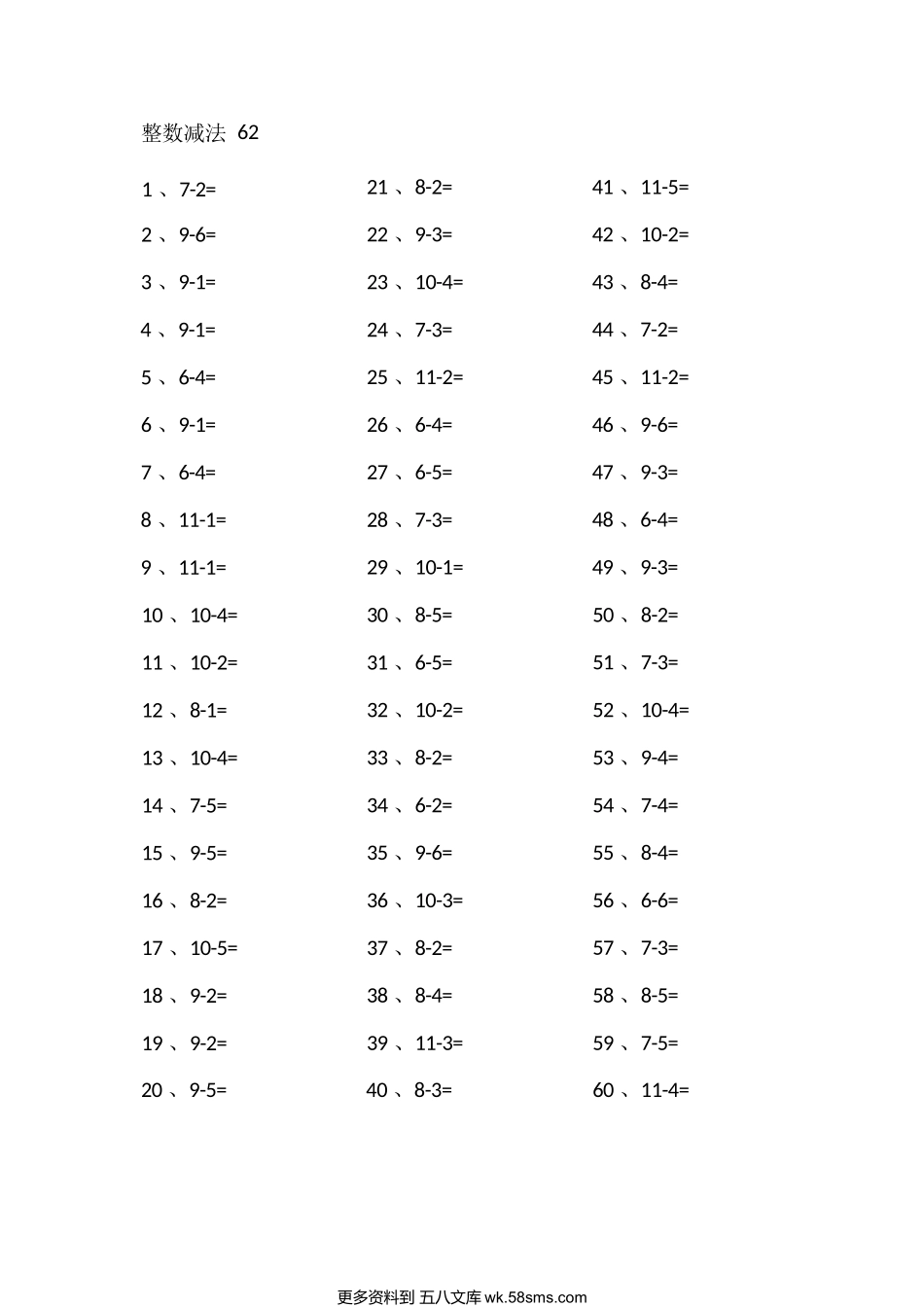 整数减法611、10-2=21、2、10-5=22、3、11-5=23、4、9-4=24、5、8-3=25、6、9-2=26、7、6-4=27、8、10-2=28、9、6-3=29、10、7-4=30、11、9-3=31、12、9-1=32、13、8-4=33、14、7-5=34、15、9-1=35、16、10-3=36...