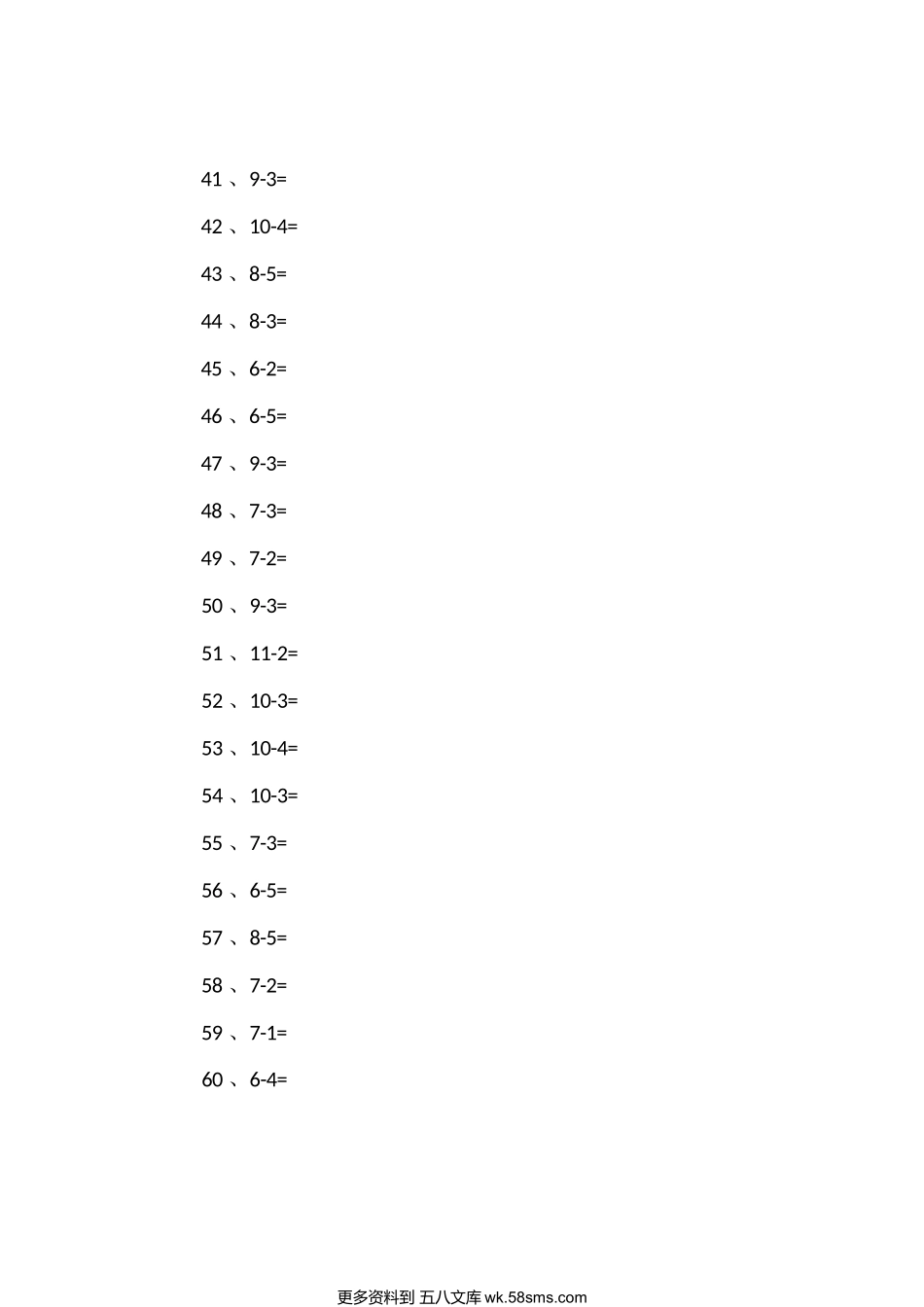 整数减法811、7-5=2、6-5=3、10-2=4、8-1=5、10-3=6、8-6=7、7-6=8、8-6=9、9-3=10、9-4=11、8-6=12、11-2=13、11-2=14、8-4=15、9-3=16、10-2=17、6-3=18、10-3=19、10-2=20、11-4=21、9-4=22、10-5=23、6-5=24...