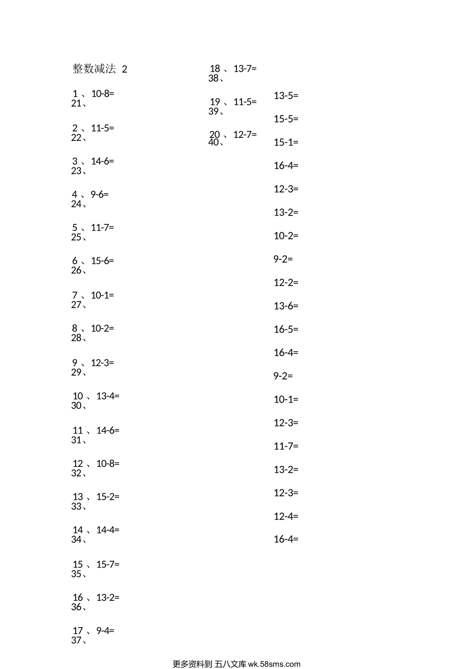整数减法11、15-2=21、2、15-2=22、3、16-8=23、4、15-2=24、5、14-2=25、6、12-5=26、7、14-6=27、8、12-3=28、9、16-5=29、10、16-5=30、11、11-2=31、12、13-4=32、13、10-3=33、14、14-3=34、15、15-3=35、16...