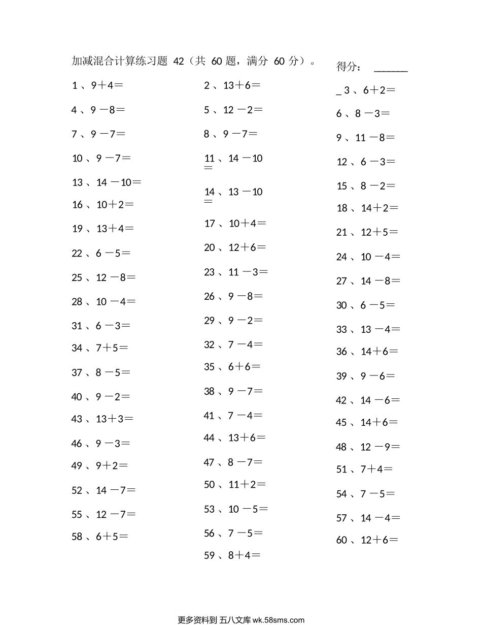 加减混合计算练习题41(共60题,满分60分)。1、7+4=4、9-5=7、12-5=10、13+4=13、13-6=16、7+2=19、9-5=22、10-2=25、6-3=28、10+4=31、8+3=34、6-3=37、14+5=40、6-4=43、7-5=46...