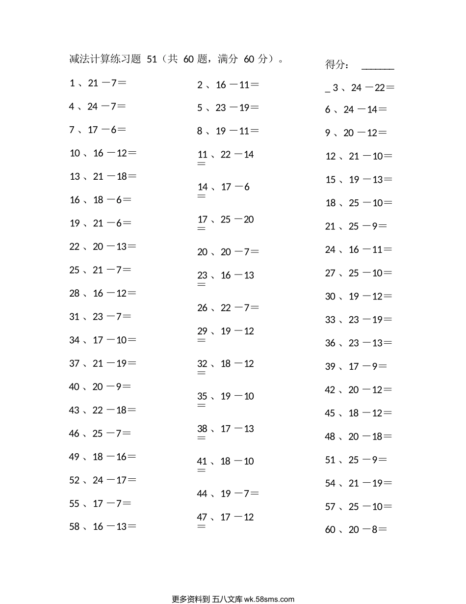 减法计算练习题51(共60题,满分60分)。1、21-7=4、24-7=7、17-6=10、16-12=13、21-18=16、18-6=19、21-6=22、20-13=25、21-7=28、16-12=31、23-7=34、17-10=37、21-19=40、20-9=43...