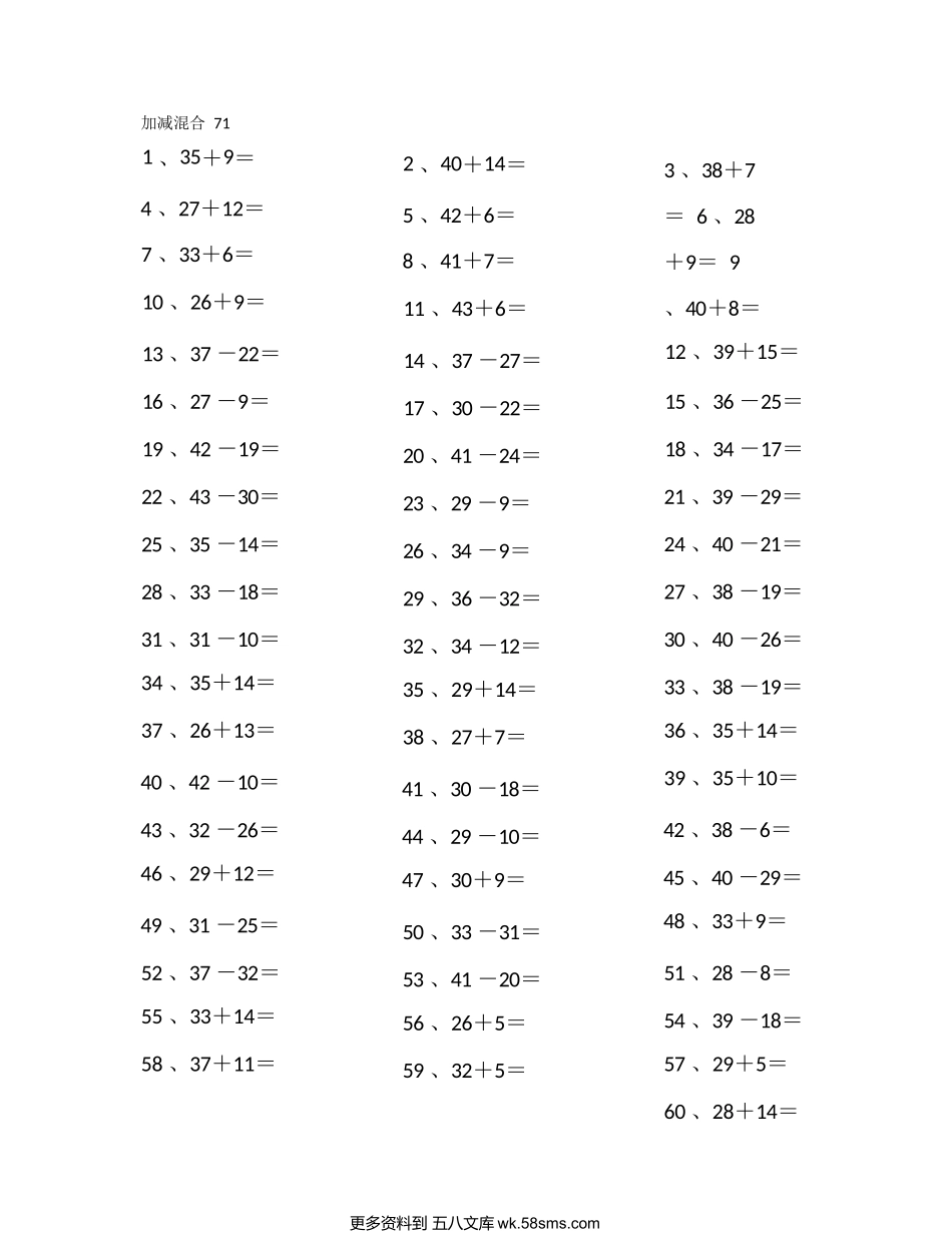 加减混合711、35+9=4、27+12=7、33+6=10、26+9=13、37-22=16、27-9=19、42-19=22、43-30=25、35-14=28、33-18=31、31-10=34、35+14=37、26+13=40、42-10=43、32-26=46、29+12=49...