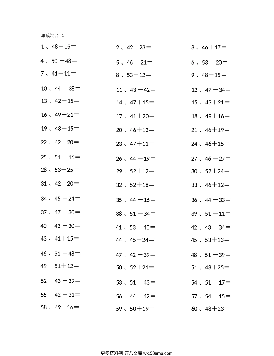 加减混合11、48+15=4、50-48=7、41+11=10、44-38=13、42+15=16、49+21=19、43+15=22、42+20=25、51-16=28、53+25=31、42+20=34、45-24=37、47-30=40、43-30=43、41+15=46、51-48...