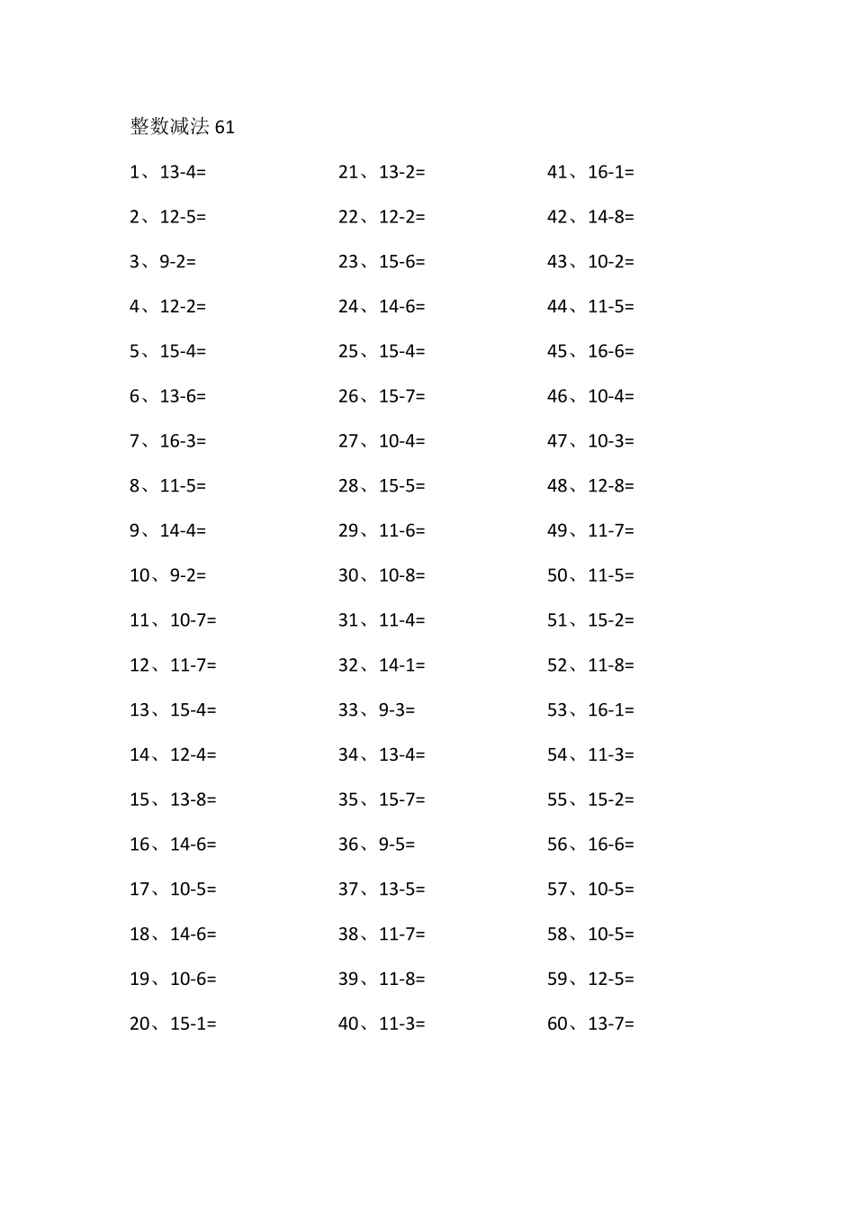 整数减法611、13-4=2、12-5=3、9-2=4、12-2=5、15-4=6、13-6=7、16-3=8、11-5=9、14-4=10、9-2=11、10-7=12、11-7=13、15-4=14、12-4=15、13-8=16、14-6=17、10-5=18、14-6=19、10-6=20、15-1=21、13-2=22、12-2=...