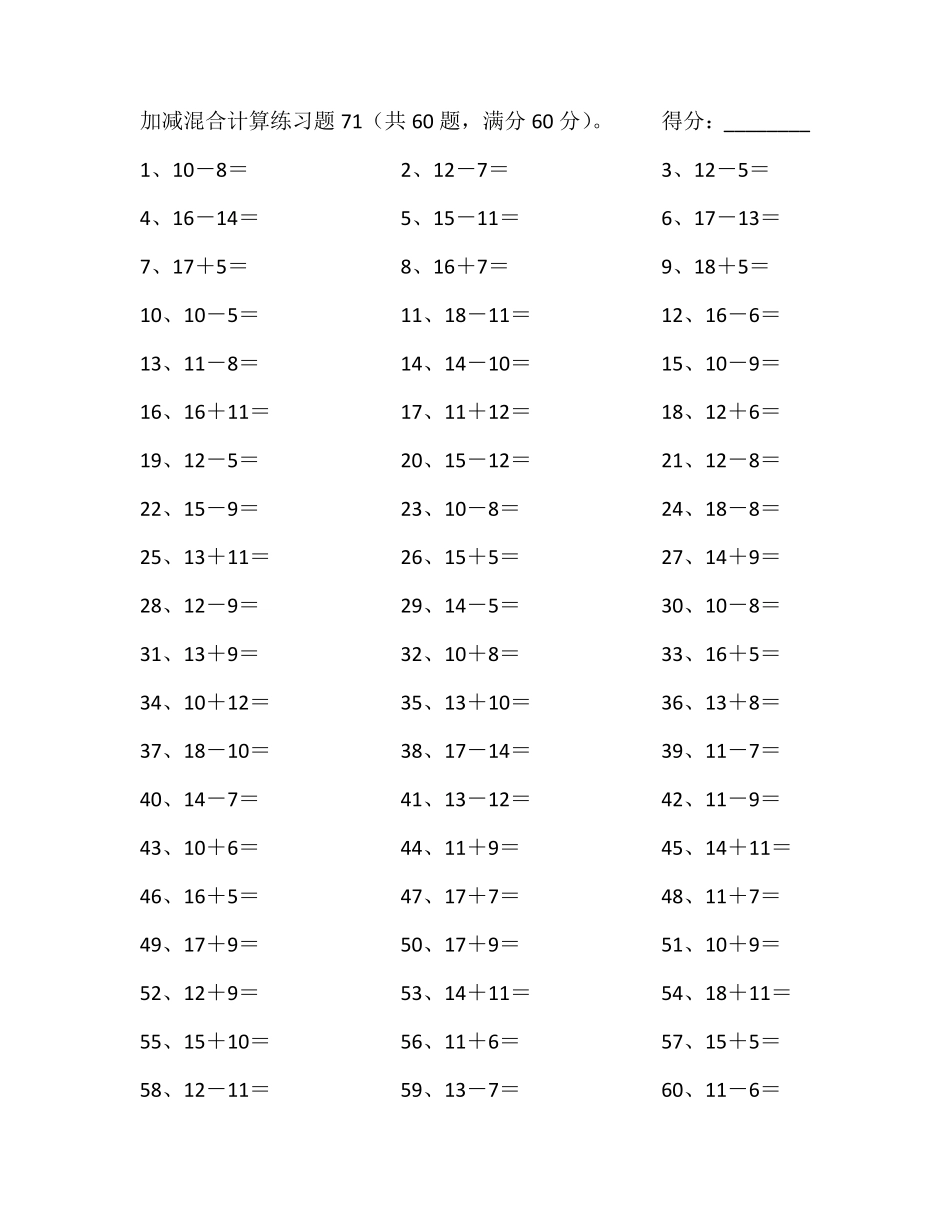 加减混合计算练习题71(共60题,满分60分)。得分:________1、10-8=2、12-7=3、12-5=4、16-14=5、15-11=6、17-13=7、17+5=8、16+7=9、18+5=10、10-5=11、18-11=12、16-6=13、11-8=14...