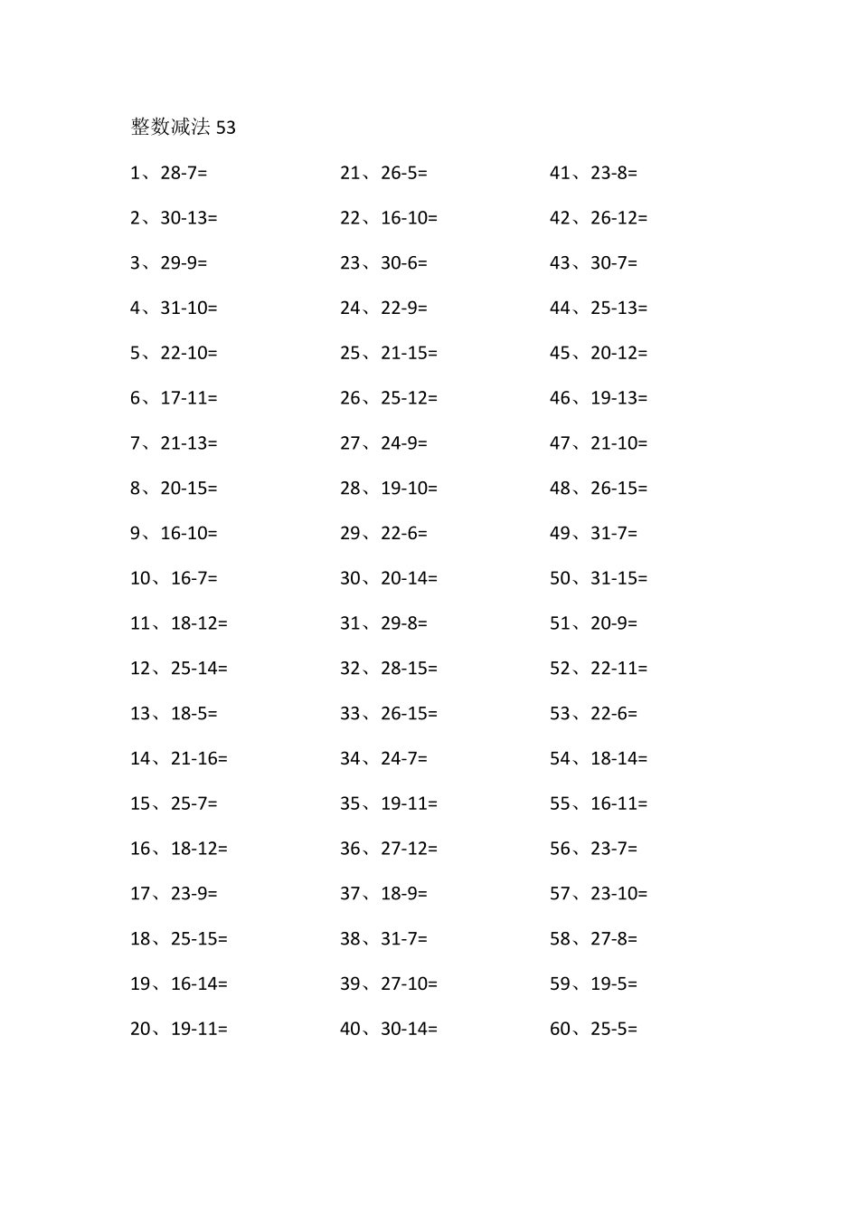 整数减法511、24-8=2、19-5=3、27-16=4、16-8=5、16-6=6、16-7=7、22-10=8、22-13=9、24-12=10、18-13=11、22-8=12、21-10=13、25-6=14、30-13=15、28-7=16、29-8=17、21-13=18、27-13=19、22-12=20、25-11=21、2...