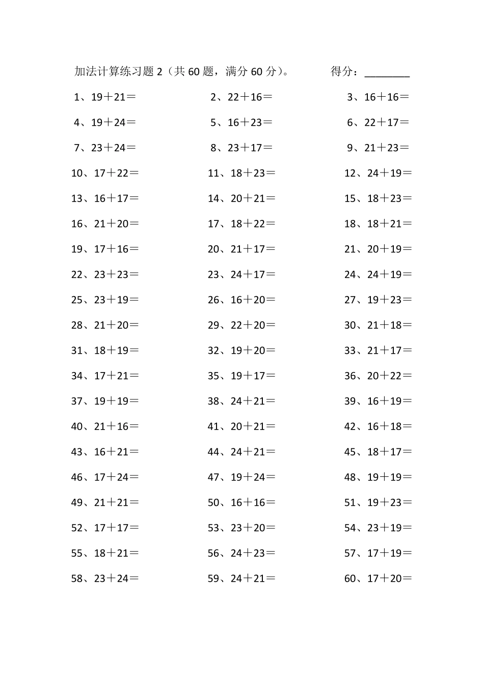 加法计算练习题1(共60题,满分60分)。得分:________1、22+17=2、17+22=3、24+21=4、17+22=5、24+17=6、16+21=7、20+22=8、16+17=9、19+20=10、18+22=11、19+24=12、17+21=13、21+22...