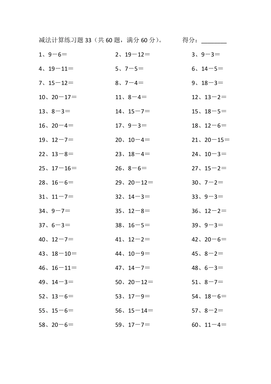 减法计算练习题31(共60题,满分60分)。得分:________1、19-14=2、12-3=3、15-6=4、18-2=5、17-7=6、16-12=7、20-3=8、13-9=9、12-7=10、6-3=11、19-10=12、11-4=13、18-16=14、11-...