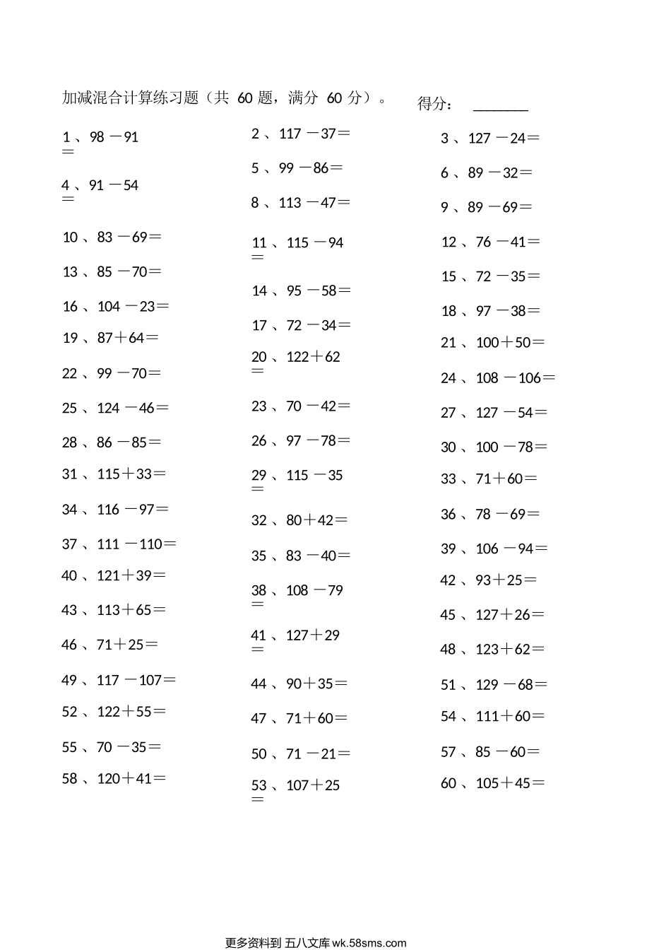 加减混合计算练习题(共60题,满分60分)。2、117-37=5、99-86=8、113-47=10、83-69=13、85-70=16、104-23=19、87+64=22、99-70=25、124-46=28、86-85=31、115+33=34、116-97=37、111-1...