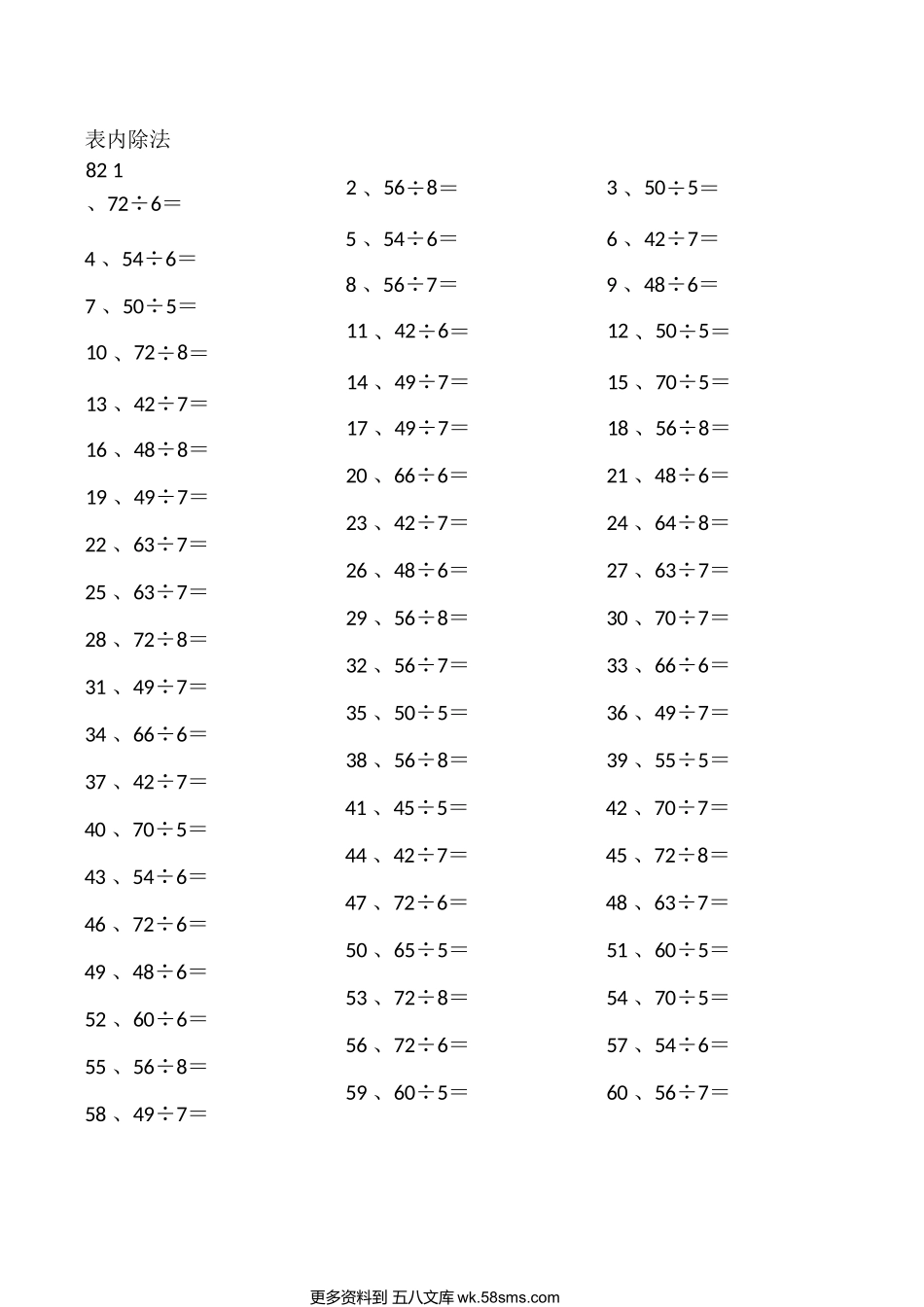表内除法811、49÷7=4、42÷6=7、75÷5=10、55÷5=13、72÷8=16、49÷7=19、42÷7=22、80÷5=25、55÷5=28、65÷5=31、64÷8=34、66÷6=37、42÷7=40、54÷6=43、60÷5=46、60÷6=49、80÷8=52...