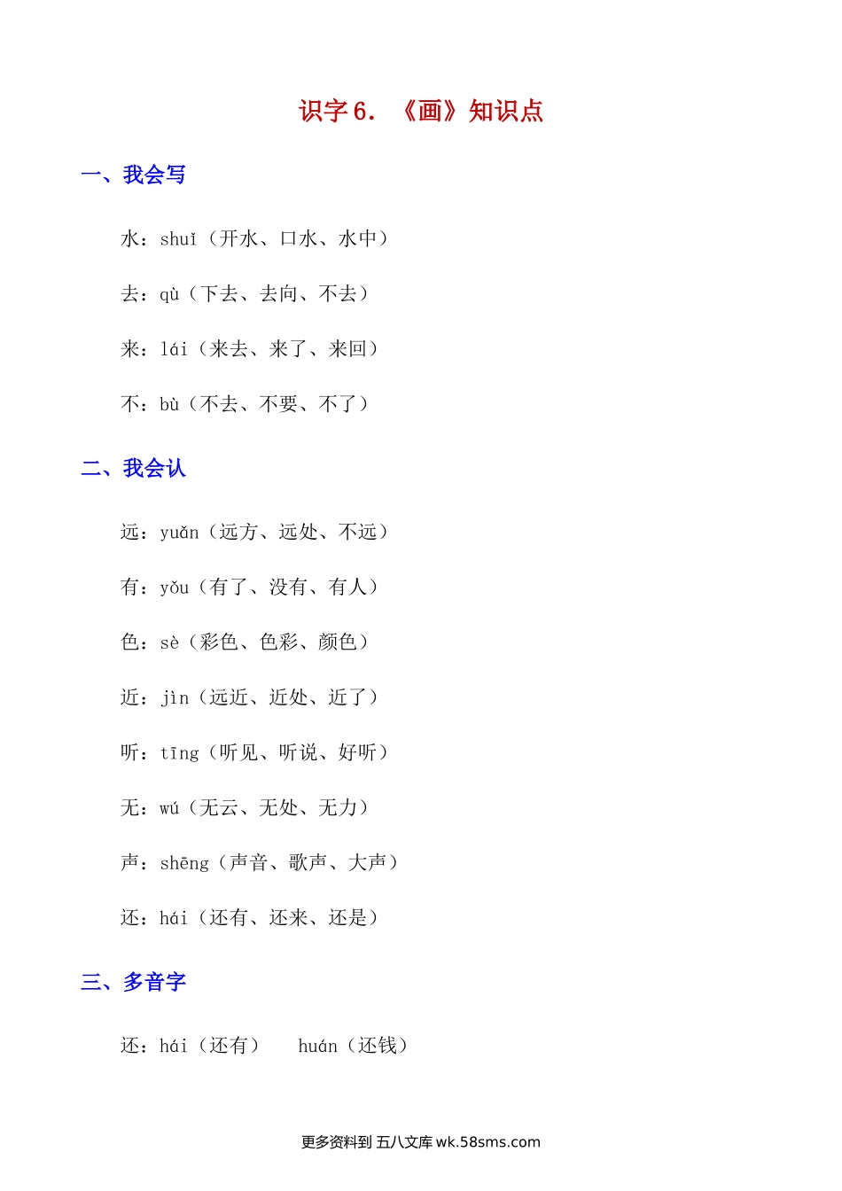 识字6.《画》知识点一、我会写水:shuǐ(开水、口水、水中)去:qù(下去、去向、不去)来:lái(来去、来了、来回)不:bù(不去、不要、不了)二、我会认远:yuǎn(远方、远处、不远)有:yǒu(有了、没...