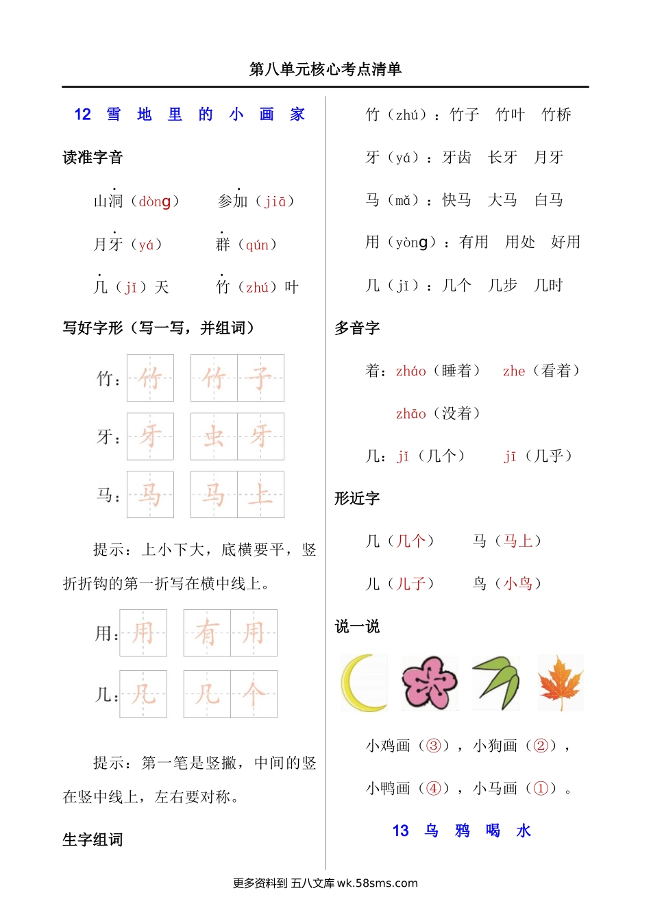 第八单元核心考点清单12雪地里的小画家读准字音山洞(dòng)参加(jiā)月牙(yá)群(qún)几(jǐ)天竹(zhú)叶写好字形(写一写,并组词)提示:上小下大,底横要平,竖折折钩的第一折写在横中线上。提...