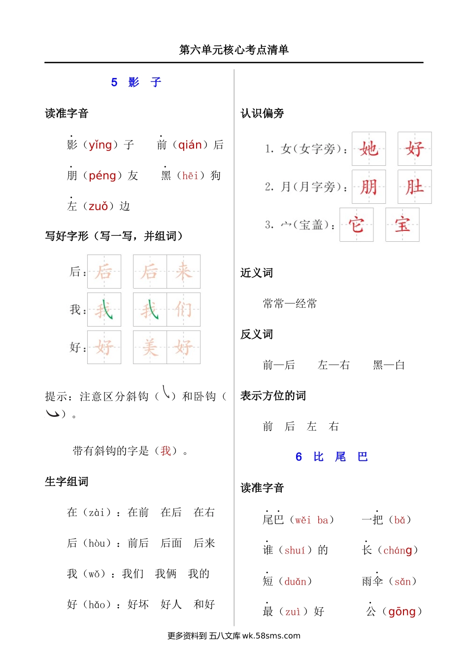 第六单元核心考点清单5影子读准字音影(yǐng)子前(qián)后朋(péng)友黑(hēi)狗左(zuǒ)边写好字形(写一写,并组词)提示:注意区分斜钩()和卧钩()。带有斜钩的字是(我)。生字组词在(zài)...
