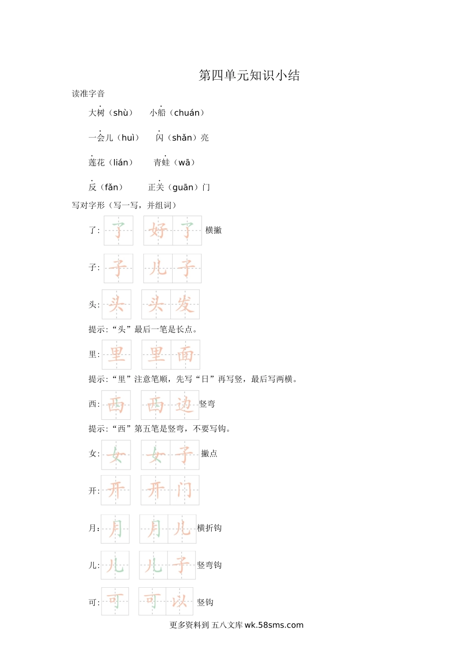 第四单元知识小结读准字音大树(shù)小船(chuán)一会儿(huì)闪(shǎn)亮莲花(lián)青蛙(wā)反(fǎn)正关(guān)门写对字形(写一写,并组词)了:横撇子:头:提示:“头”最后一笔是长点。里:提...