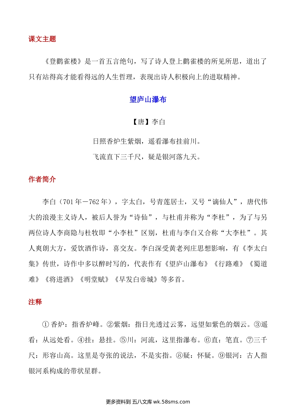 8.《古诗二首》知识点登鹳雀楼【唐】王之涣白日依山尽,黄河入海流。欲穷千里目,更上一层楼。作者简介王之涣(688年-742年),是盛唐时期的著名诗人,字季凌,汉族,绛州(今山西新绛县)人。豪放不羁,常击剑...