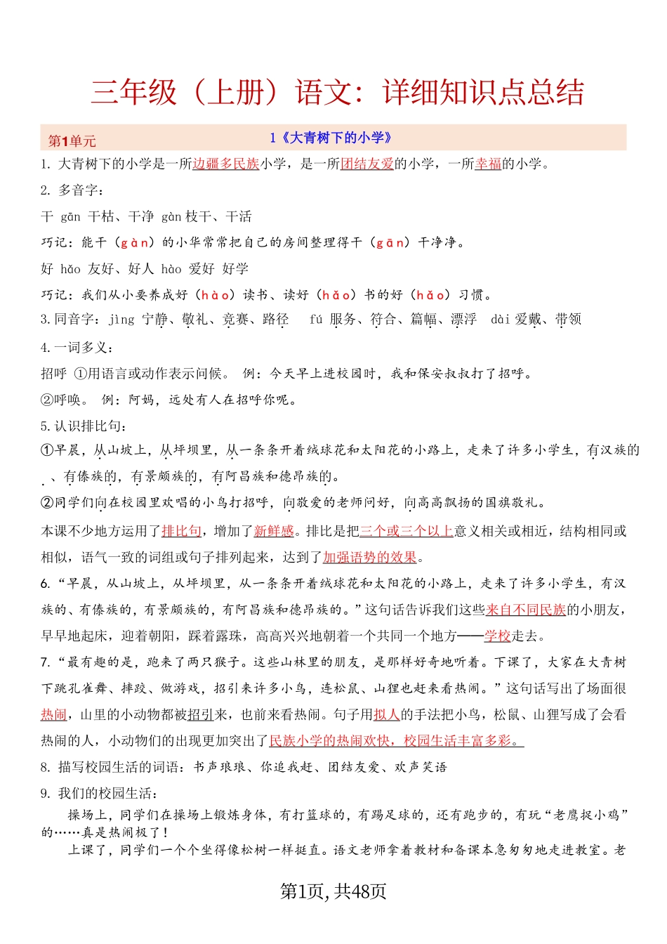 1《大青树下的小学》巧记:能干1.大青树下的小学是一所边疆多民族小学,是一所团结友爱的小学,一所幸福的小学。2.多音字:干gān干枯、干净gàn枝干、干活(gàn)的小华常常把自己的房间整理得干(好hǎo友好、...