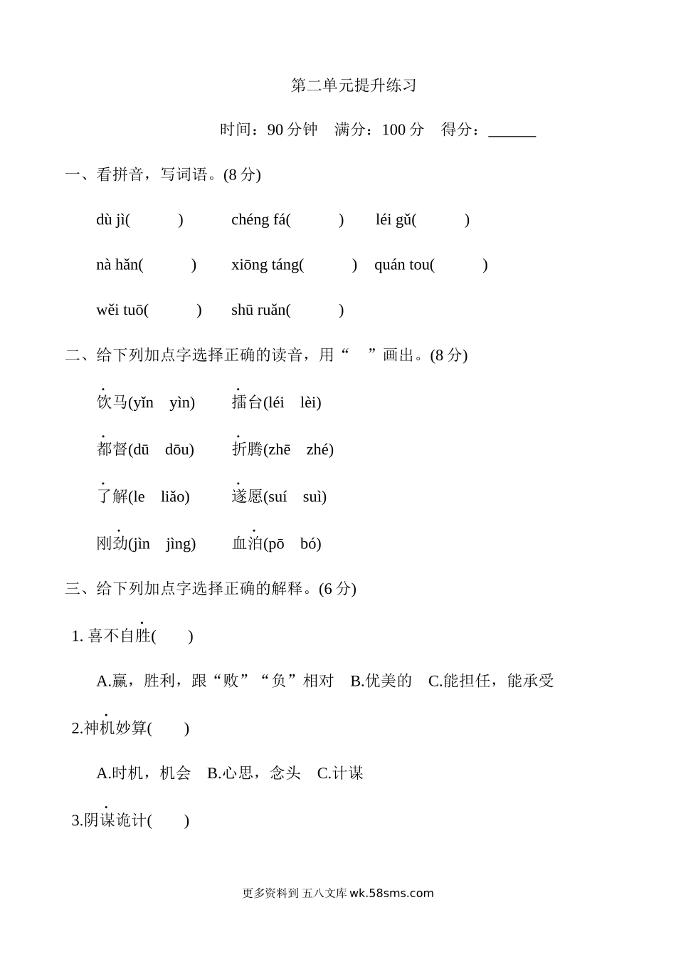 第二单元提升练习时间:90分钟满分:100分得分:一、看拼音,写词语。(8分)dùjì()chéngfá()léigǔ()nàhǎn()xiōngtáng()quántou()wěituō()shūruǎn()二、给下列加点字选择正确的读音,用“􀳫”画出。...