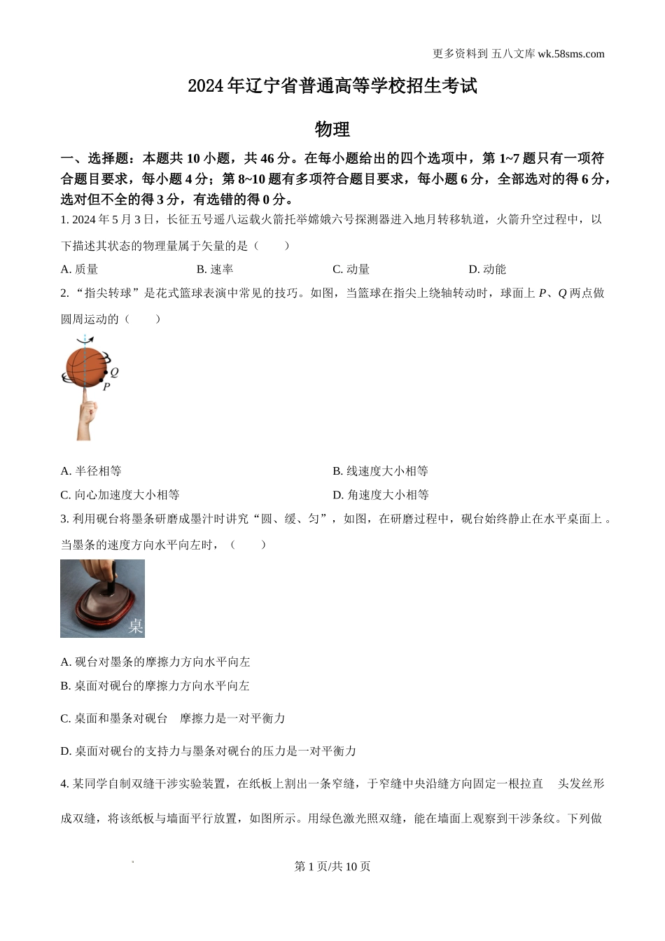 更多资料到五八文库wk.58sms.com2024年辽宁省普通高等学校招生考试物理一、选择题:本题共10小题,共46分。在每小题给出的四个选项中,第1~7题只有一项符合题目要求,每小题4分;第8~10题有多项符合题目要求,每...