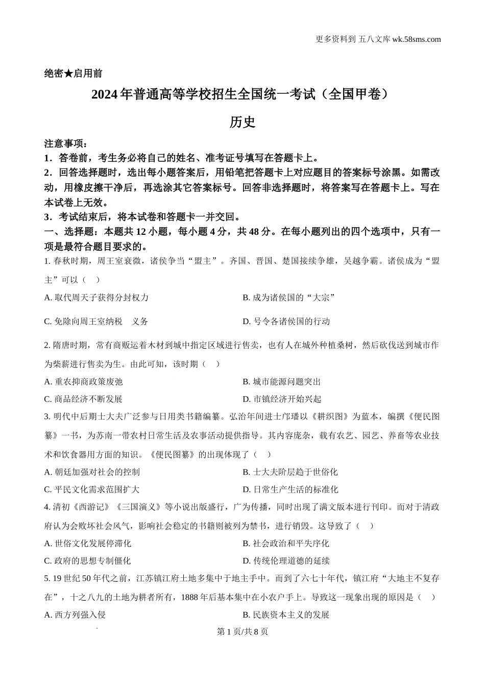 更多资料到五八文库wk.58sms.com绝密★启用前2024年普通高等学校招生全国统一考试(全国甲卷)历史注意事项:1.答卷前,考生务必将自己的姓名、准考证号填写在答题卡上。2.回答选择题时,选出每小题答案后,用...