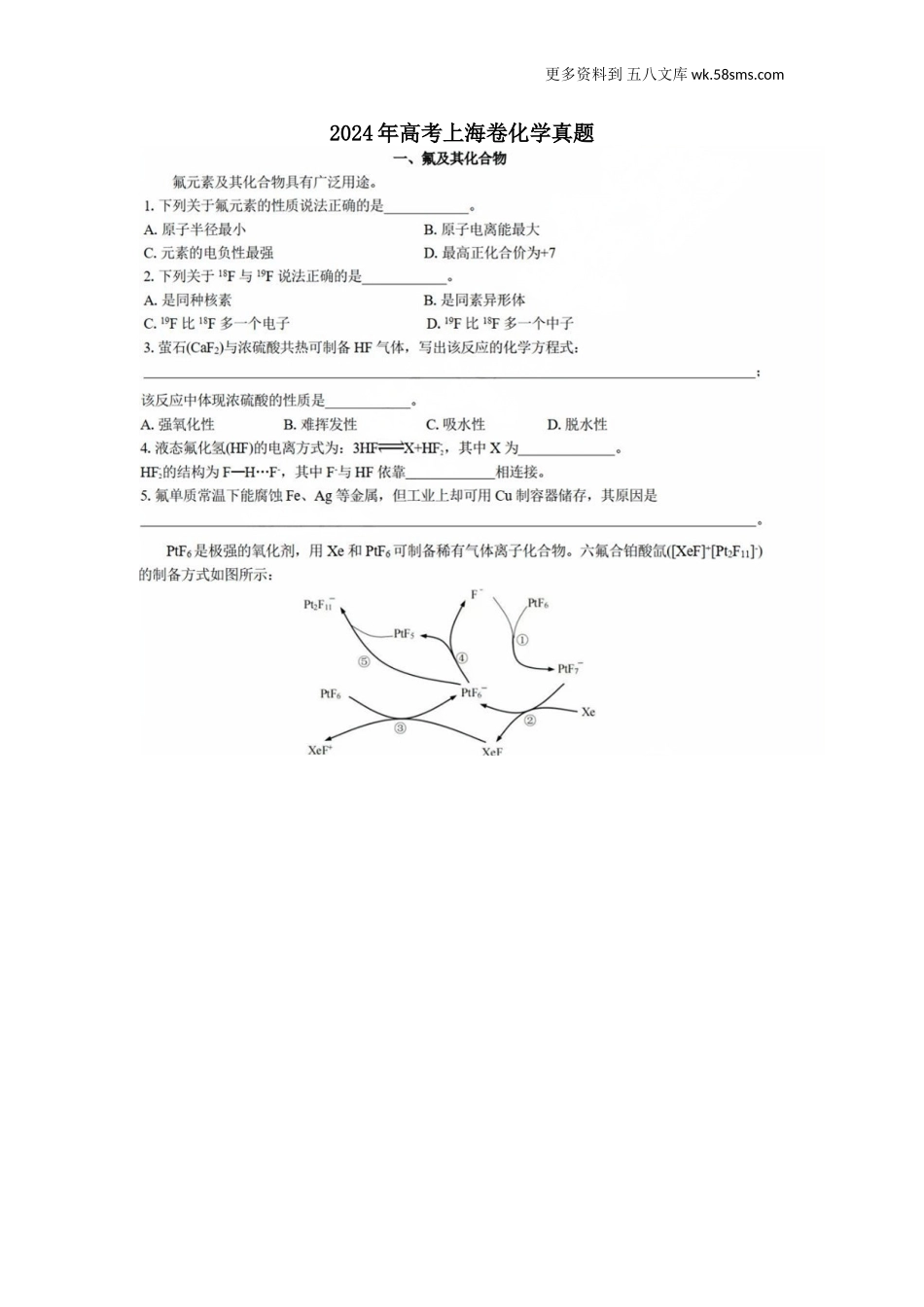 更多资料到五八文库wk.58sms.com2024年高考上海卷化学真题更多资料到五八文库wk.58sms.com更多资料到五八文库wk.58sms.com更多资料到五八文库wk.58sms.com更多资料到五八文库wk.58sms.com更多资料到五八文库wk.58...