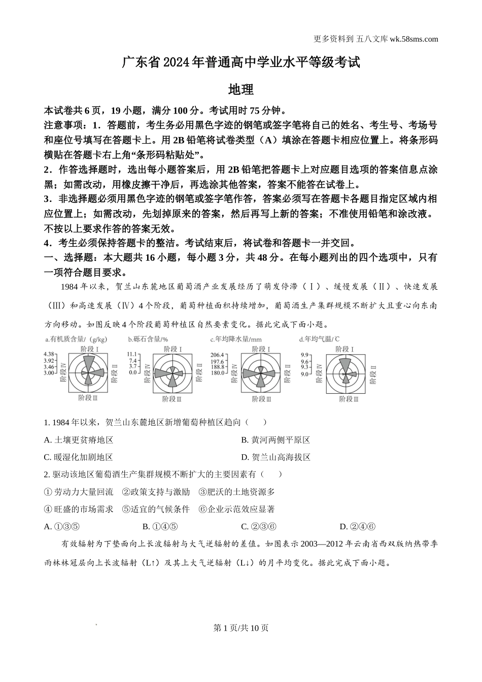 更多资料到五八文库wk.58sms.com广东省2024年普通高中学业水平等级考试地理本试卷共6页,19小题,满分100分。考试用时75分钟。注意事项:1.答题前,考生务必用黑色字迹的钢笔或签字笔将自己的姓名、考生号、考场...